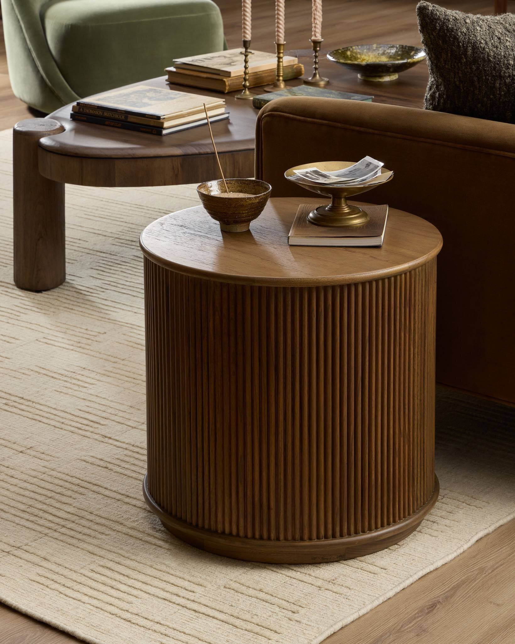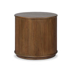 The Ona End Table showcases handcrafted detail with its carved reeding pattern that wraps the entire surface. Built from warm mindi wood with a sturdy plinth base, it brings tactile interest and artisanal charm to any room. This approachable yet refined piece works equally well beside a sofa or in a bedroom, adding character wherever it's placed.