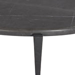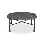 The Rayna Coffee Table pairs luxurious materials with thoughtful design. A sleek grey Italian marble top rests on an elegant bronze-finished iron base, where squared hourglass legs and centered ball details create visual lightness despite the substantial materials. This sophisticated blend of stone and metal brings understated glamour to any living room.