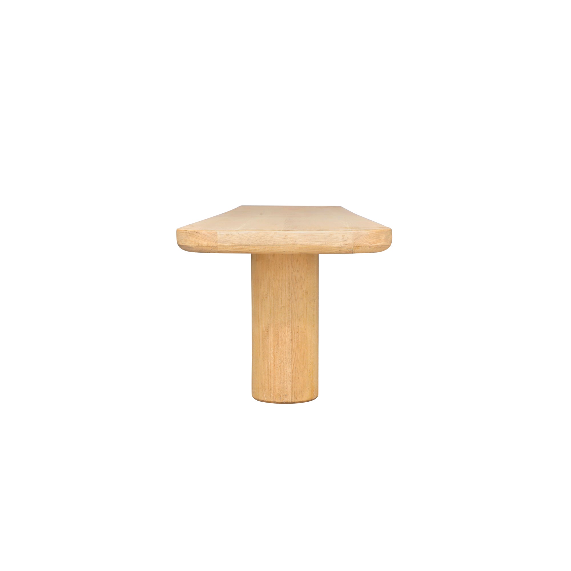 The Alda dining bench presents a minimalist design with a softly rounded half-bullnose edge and slender column legs, creating a light and airy appearance that complements diverse interior styles. Constructed from FSC-certified oak, each bench displays unique grain patterns and knots, adding individuality. Seating three comfortably, this adaptable piece combines timeless elegance with sustainable craftsmanship, fitting seamlessly into any space.