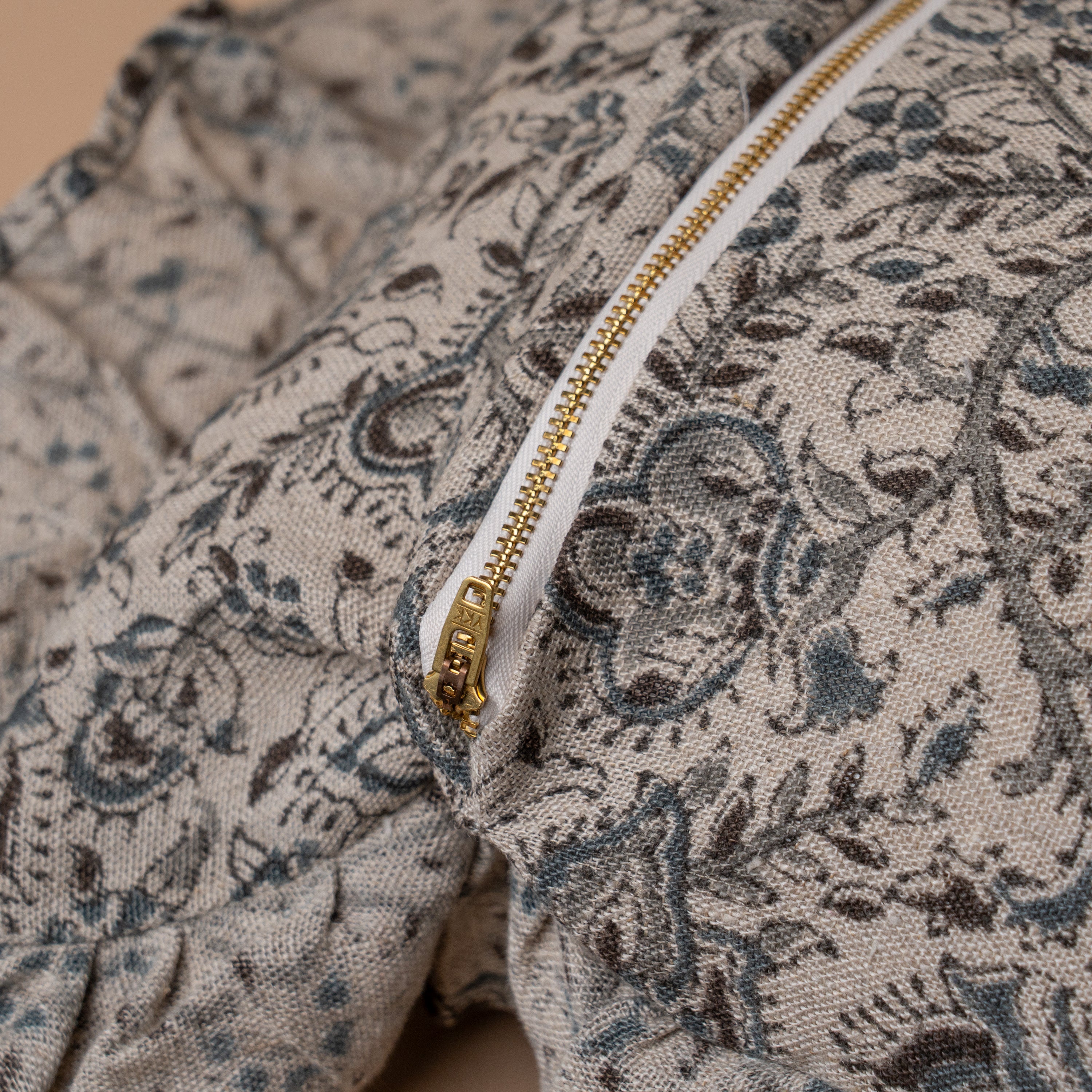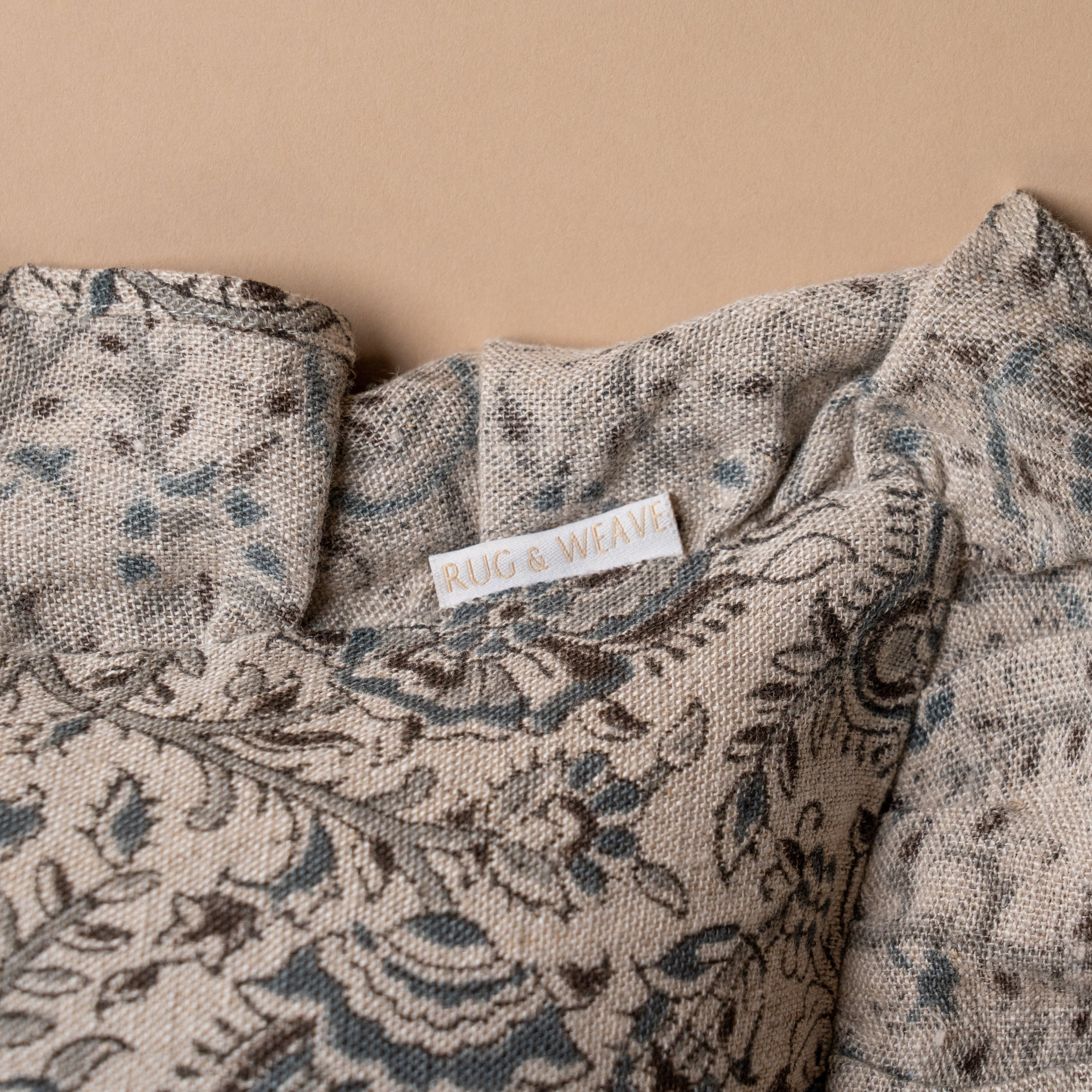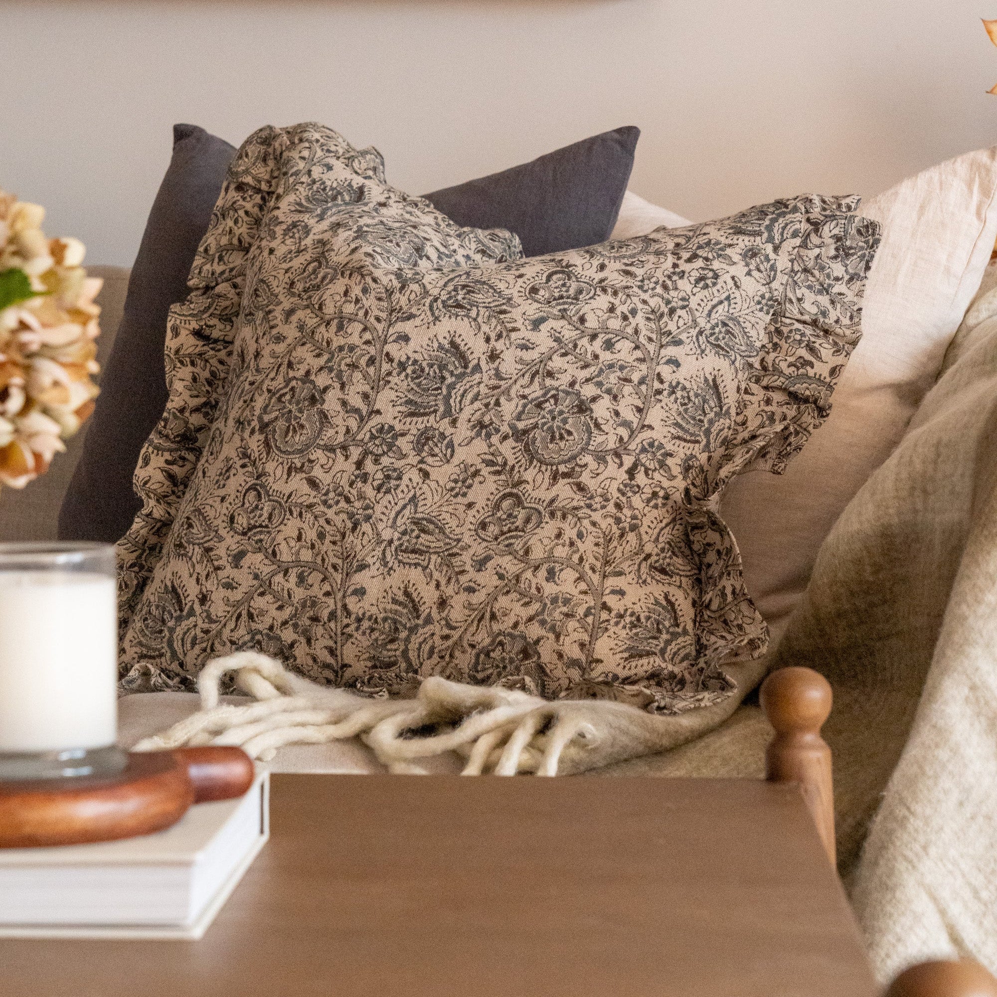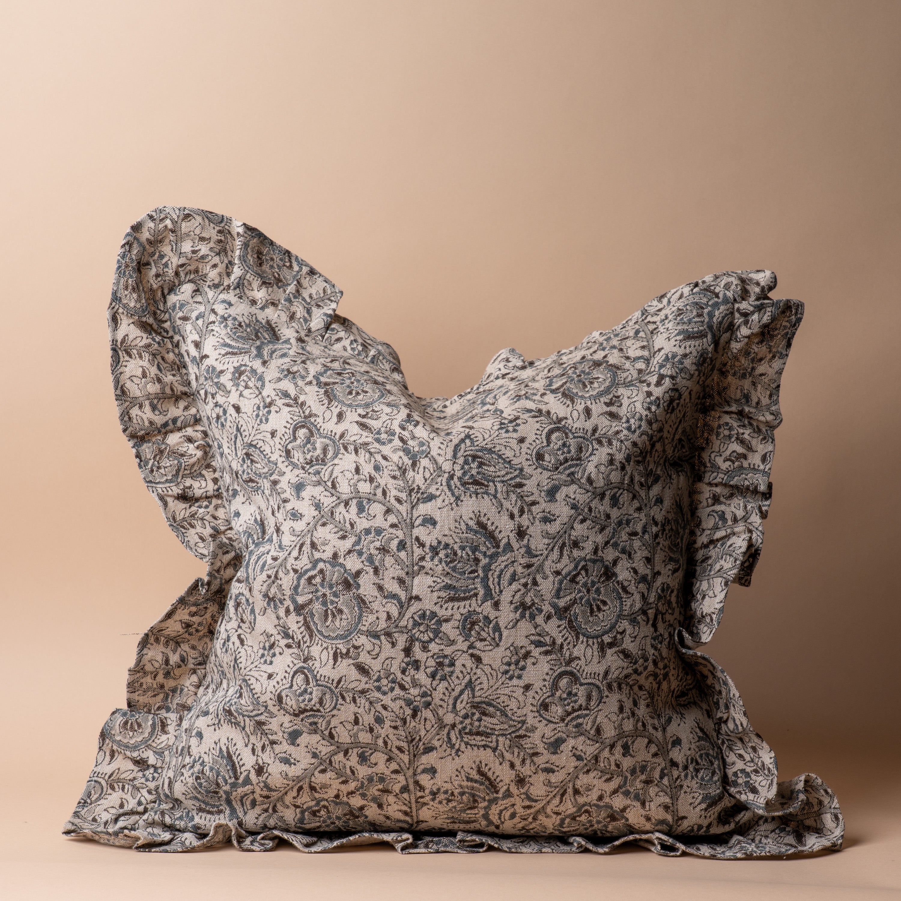 Meet our Aubrey Ruffle! Our beloved botanical motif on a neutral background with muted cool tones of blue and grey. Double sided and surrounded by a soft ruffle border, this linen covers is sure to be a conversation starter! Hand block printed on a rustic linen, these pillow covers are truly works of art.