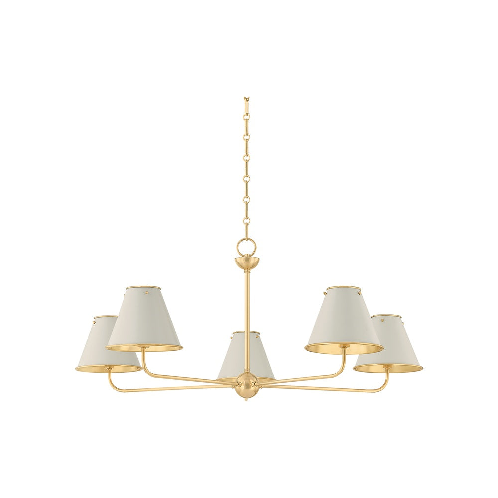 The Burghley collection embodies a refined, tailored design with streamlined metal shades and clean lines. Incorporating Mark D. Sikes’ distinctive brass ball motif and elegant bolts that fasten the shades, Burghley revitalizes classic heritage shapes. Available in Aged Brass paired with Off White or Distressed Bronze, the 5-light chandelier and 2-light linear fixture introduce a subtle sophistication suited to both contemporary and traditional settings.