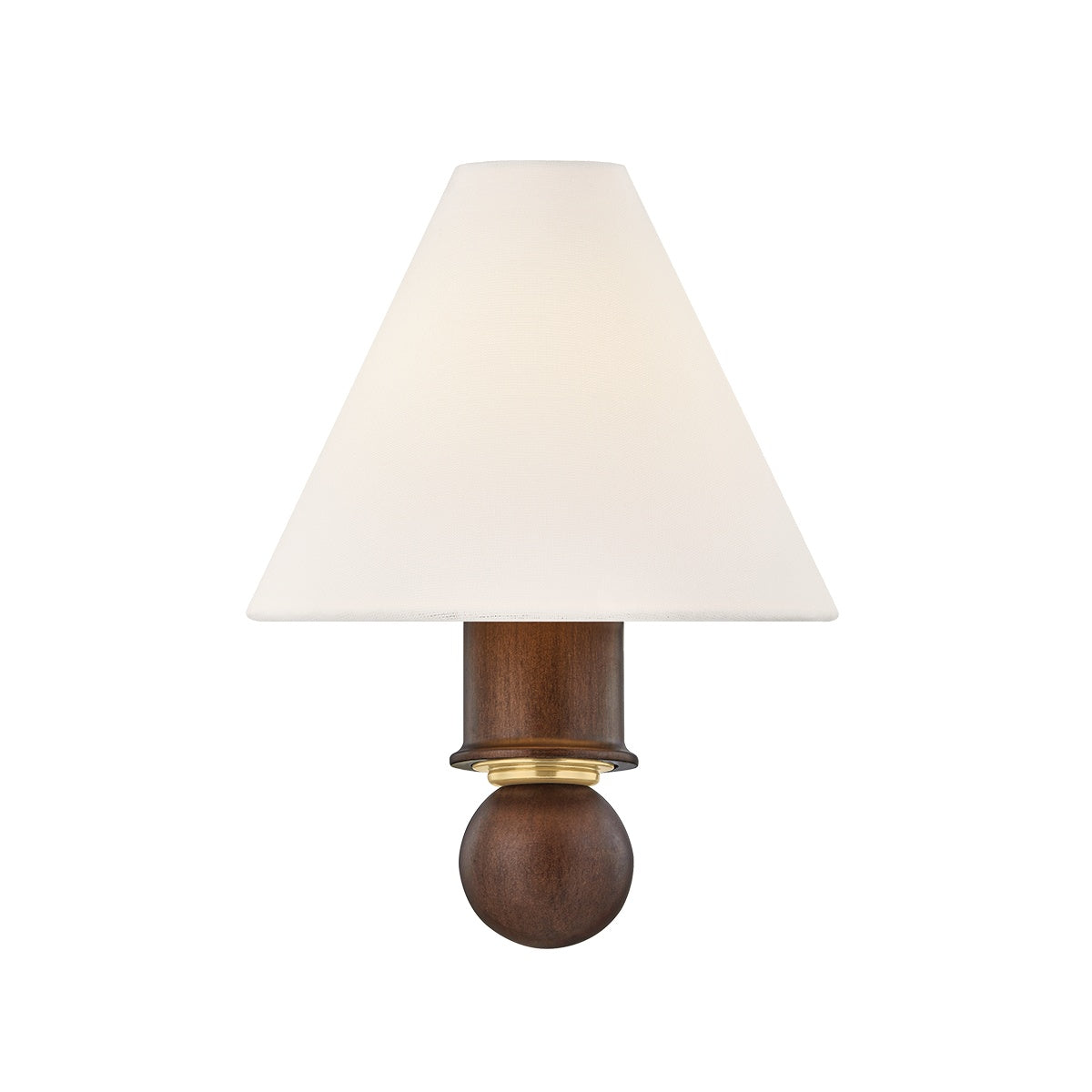 A petite sconce with a large presence, Candice pairs a distinctive turned wood stem with a white linen half-shade. The polished wood evokes a sense of heritage and craftsmanship, enhanced by the decorative shaping. An Aged Brass reflector beneath the shade creates a soft, warm glow, adding to Candice’s antique-inspired charm.