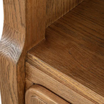 Discover the elegant and functional Claude Bookcase. Its overhanging top and curved front legs create a graceful silhouette, while the rounded edges on the bottom drawer add fluidity. The mid-tone brown finish with a wire-brushed texture complements any style, and with four fixed shelves and a storage drawer, it offers ample space.