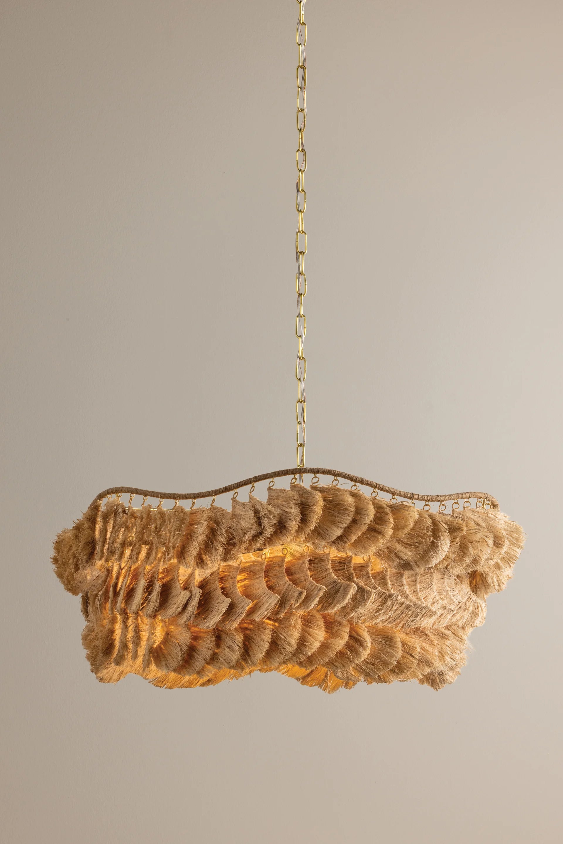 The Daria chandelier makes a strong case for craftsmanship, finding ease in a complex composition. The undulating, wrapped frame is exposed at the top, celebrating the suspension of each separate piece of the shade. Soft, flowing strands of natural raffia form textured, wave-like layers that face different directions to create the shaggy fixture. An Aged Brass finish adds a polished touch to this fiber art-inspired beauty. Daria is available in two sizes.