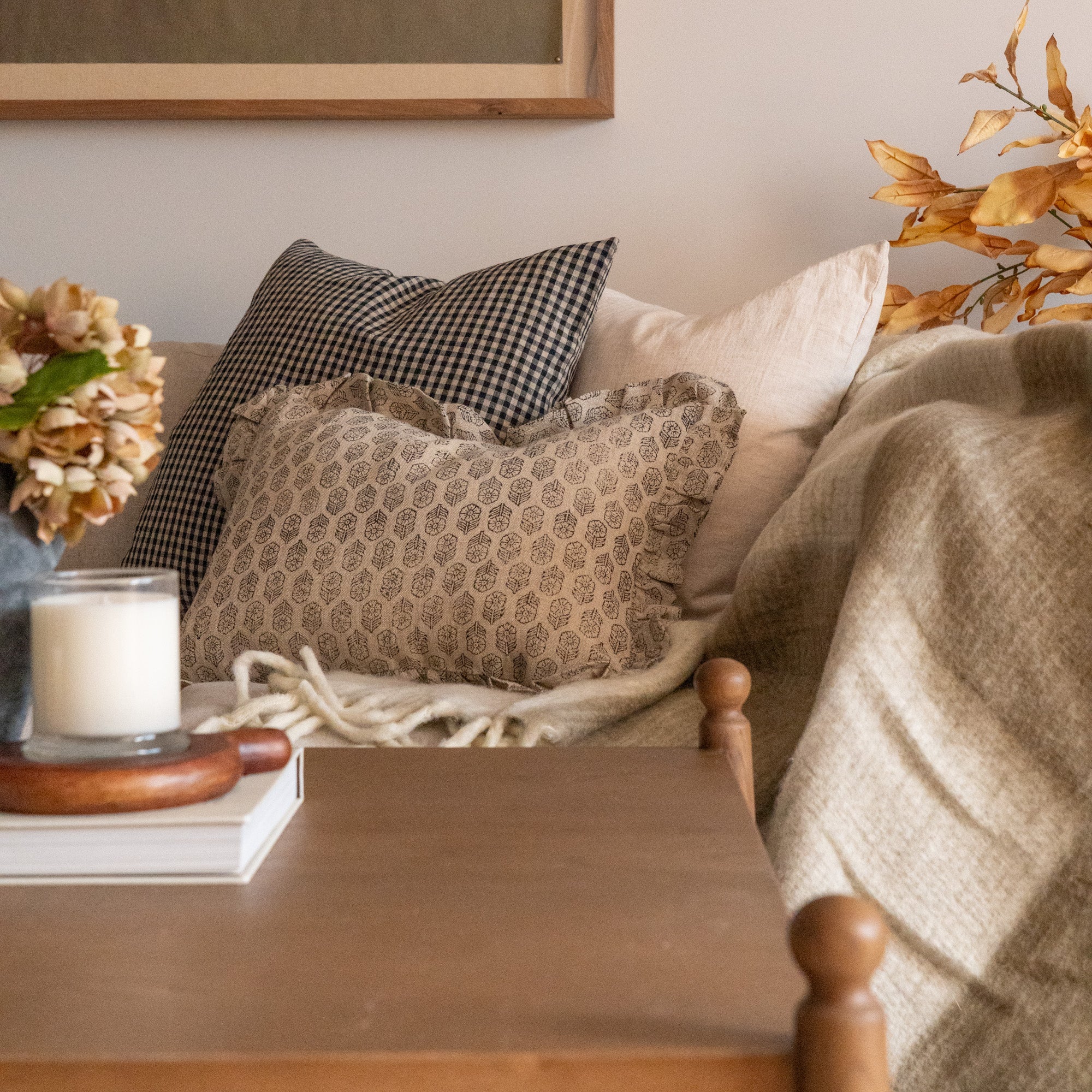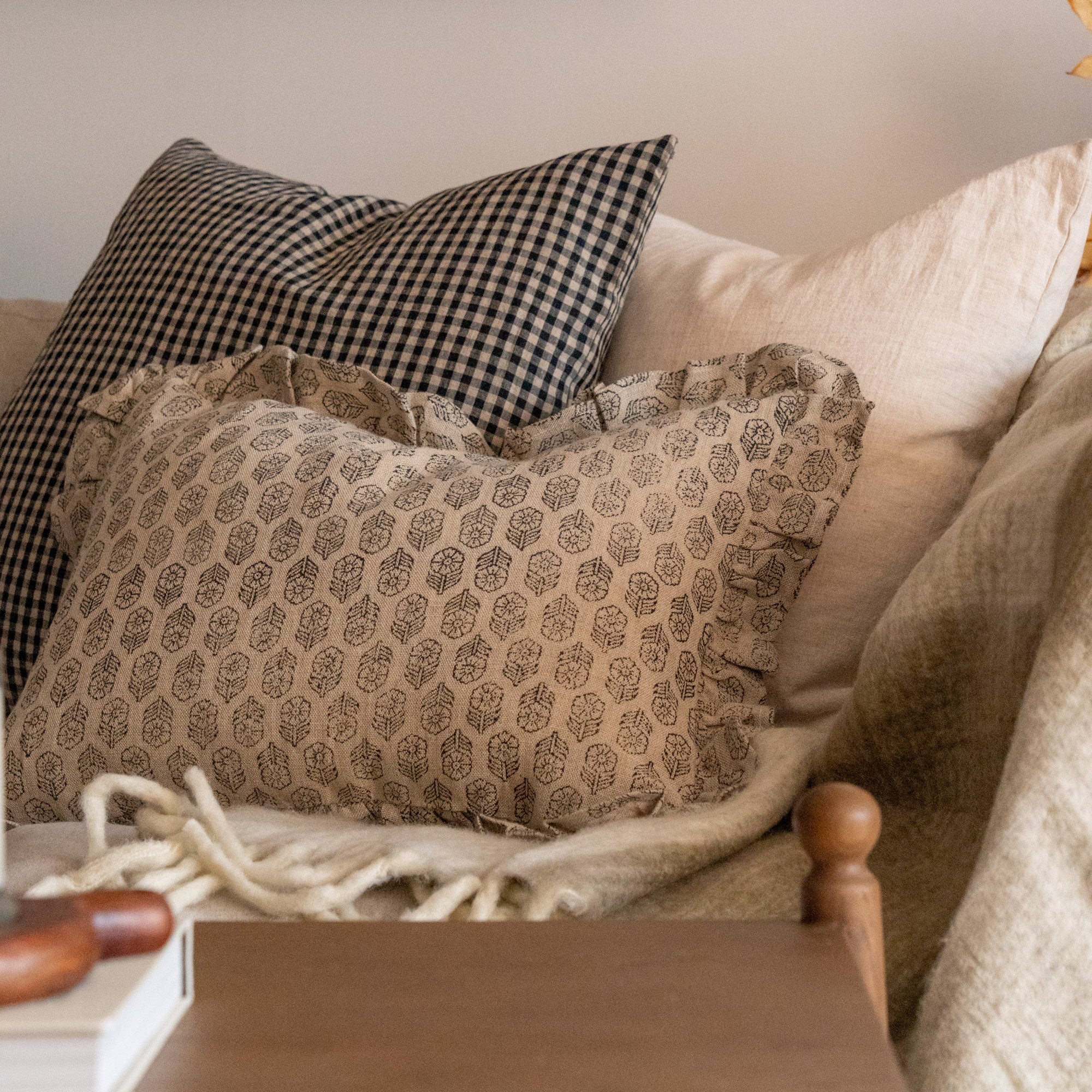 Bring a timeless charm to your home decor with our Dolly Block Print Ruffle Pillow Cover. Crafted from hand block printed linen, this cover features a classic floral print with a fluttering ruffle that adds a feminine touch to any room. Its neutral tones and rustic charm add character to any space.