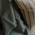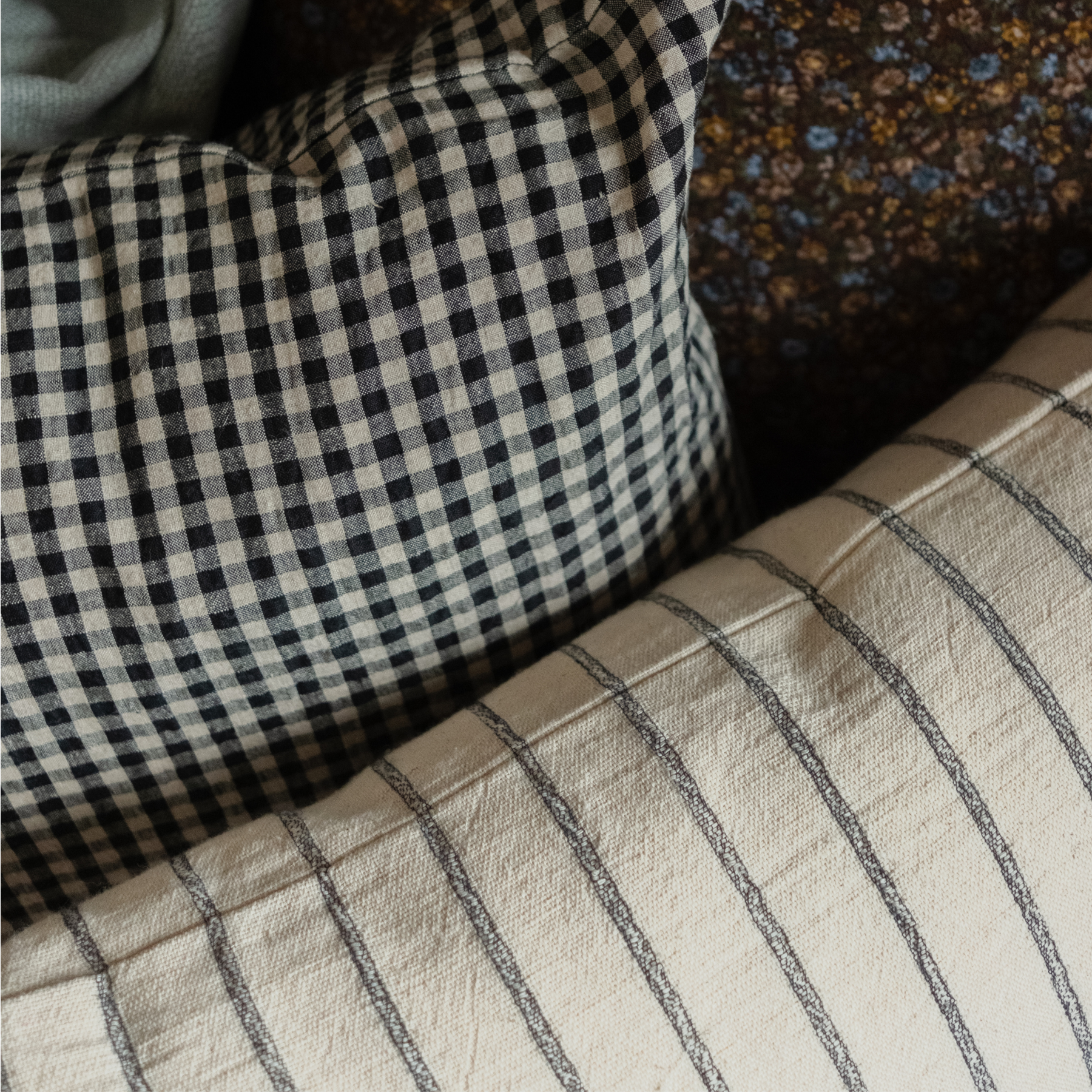 Our best selling Thai Simple Stripes now available in a double sided cover! This neutral fabric is hand-loomed in a traditional weaving practice, and features a woven stripe in a contrasting charcoal. Wrapped around the entire pillow for a more designer and luxurious feel. Style this perfect staple in your home today!
