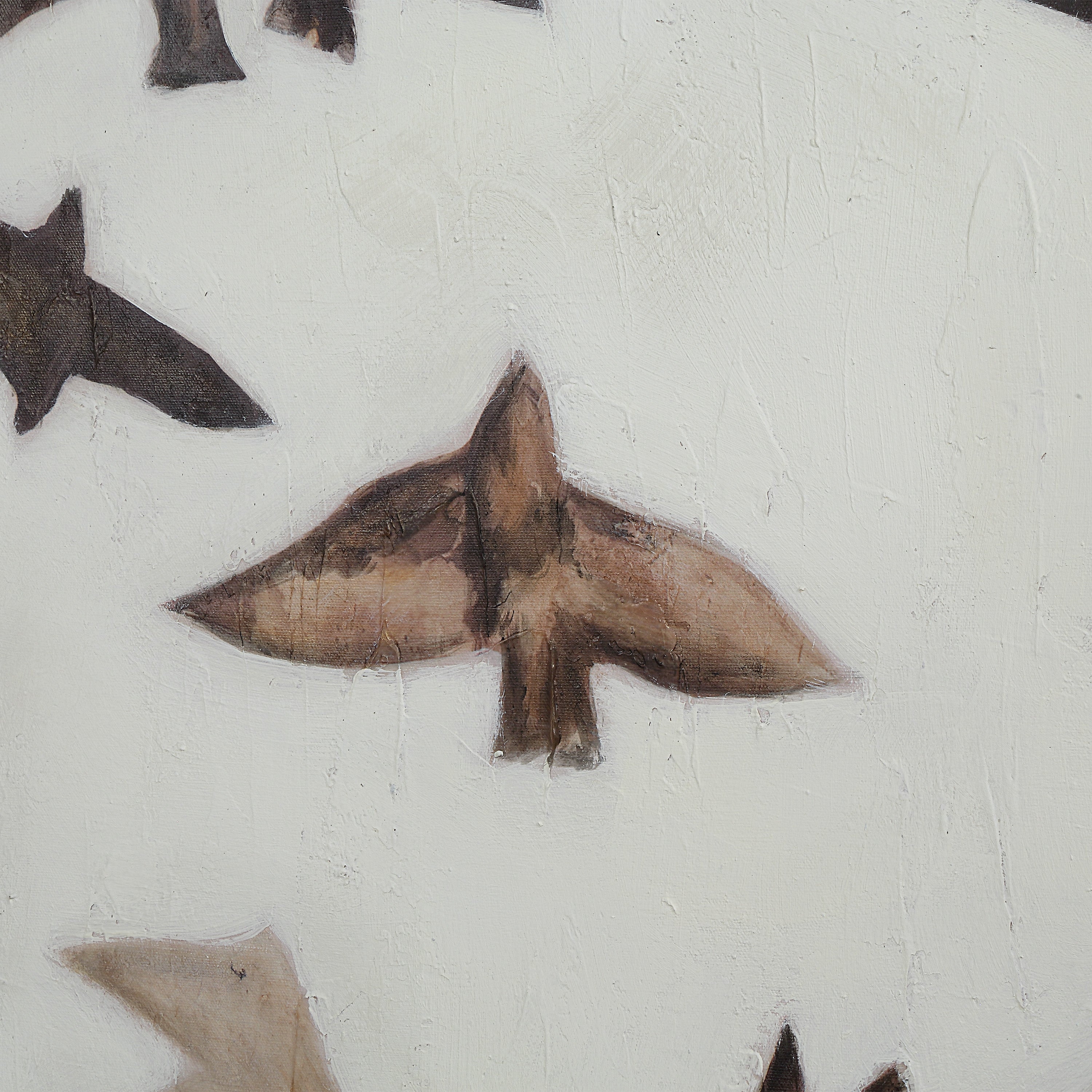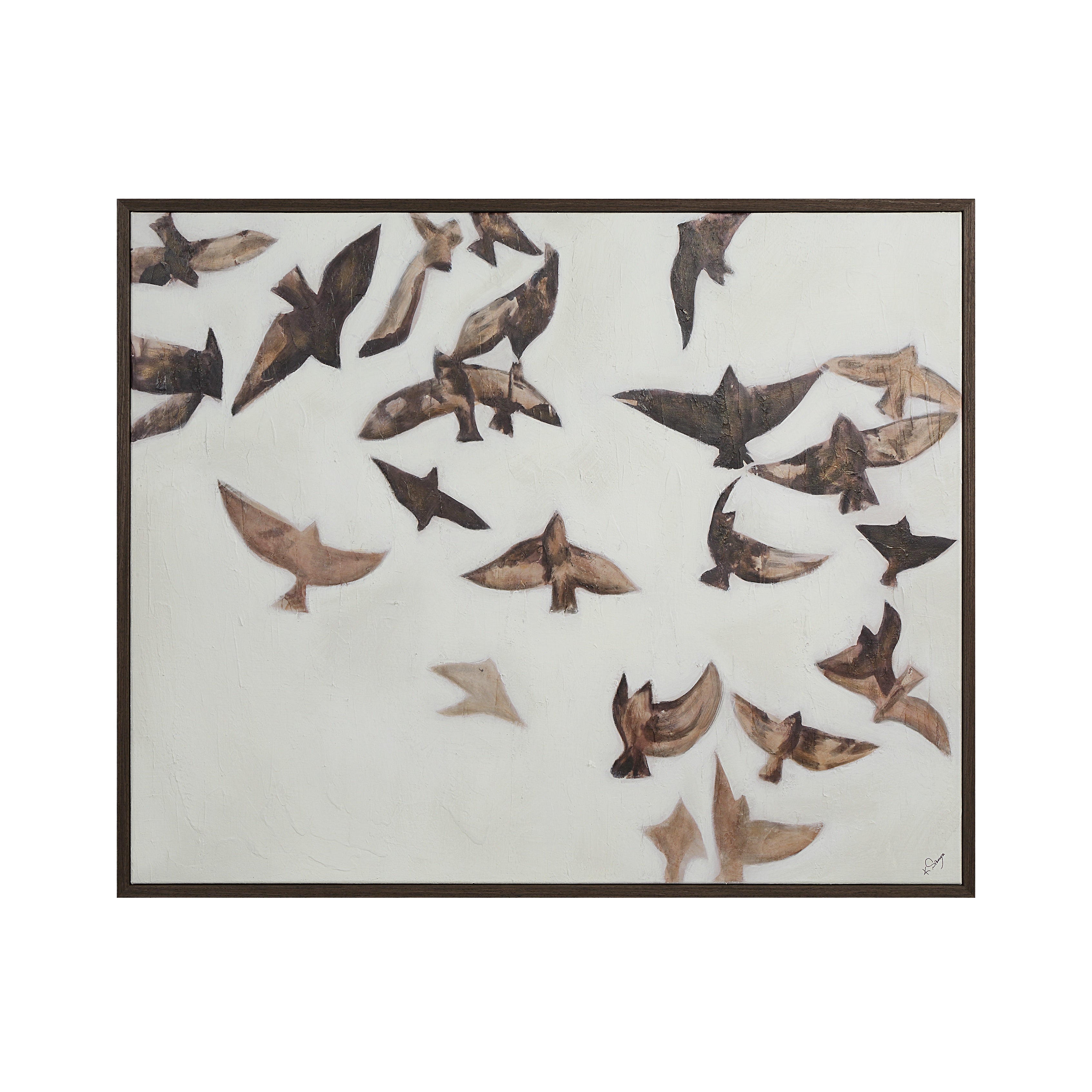 Add a whimsical element to your design with the lively spirit of this framed canvas art. Warm-toned bird silhouettes dynamically contrast against a crisp white background, infusing movement and feeling into any room. Set in a dark brown veneer frame, this textured, hand-painted artwork complements modern interiors with refined elegance.