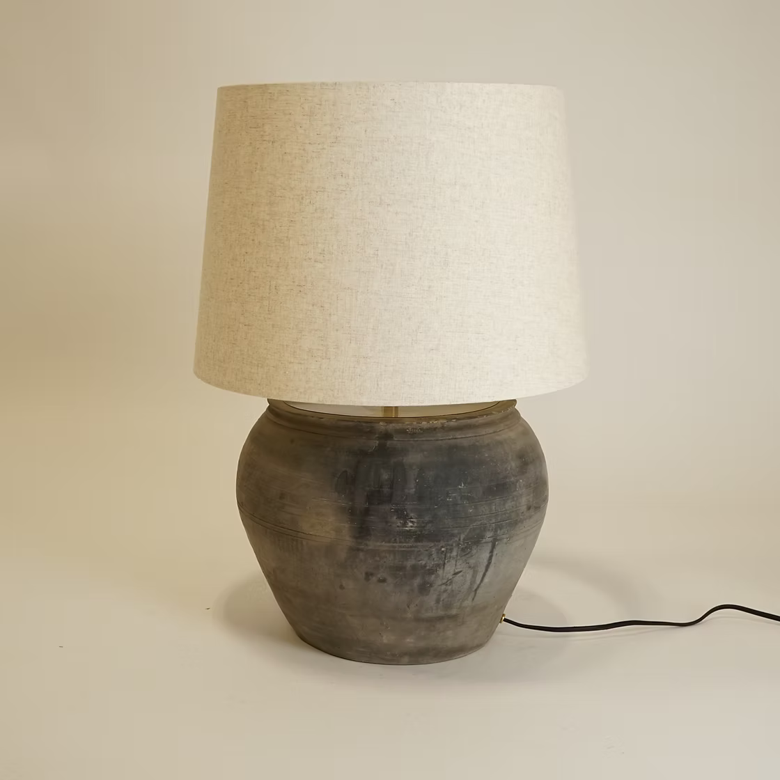Transform your space with this distinctive floor lamp, born from a reclaimed vintage pot that carries decades of character. The weathered, textured base celebrates authentic craftsmanship and history, with each mark telling its own story. Paired with a tailored lampshade, it delivers warm, understated sophistication while honoring the beauty of repurposed design. A conversation piece that brings soul to any room.
