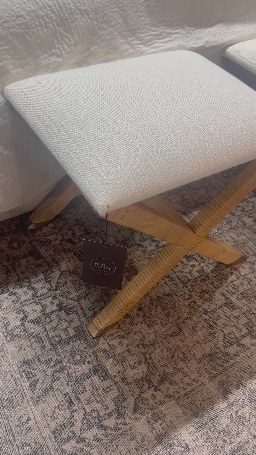 Elevate any space with the versatile Taffeta Small Bench. Its x-base, wrapped in natural rattan, exudes a casual yet polished vibe, while the plush, textured white polyester seat provides comfort. With antique brass foot caps and unlimited styling possibilities, this bench is the perfect addition to any room.