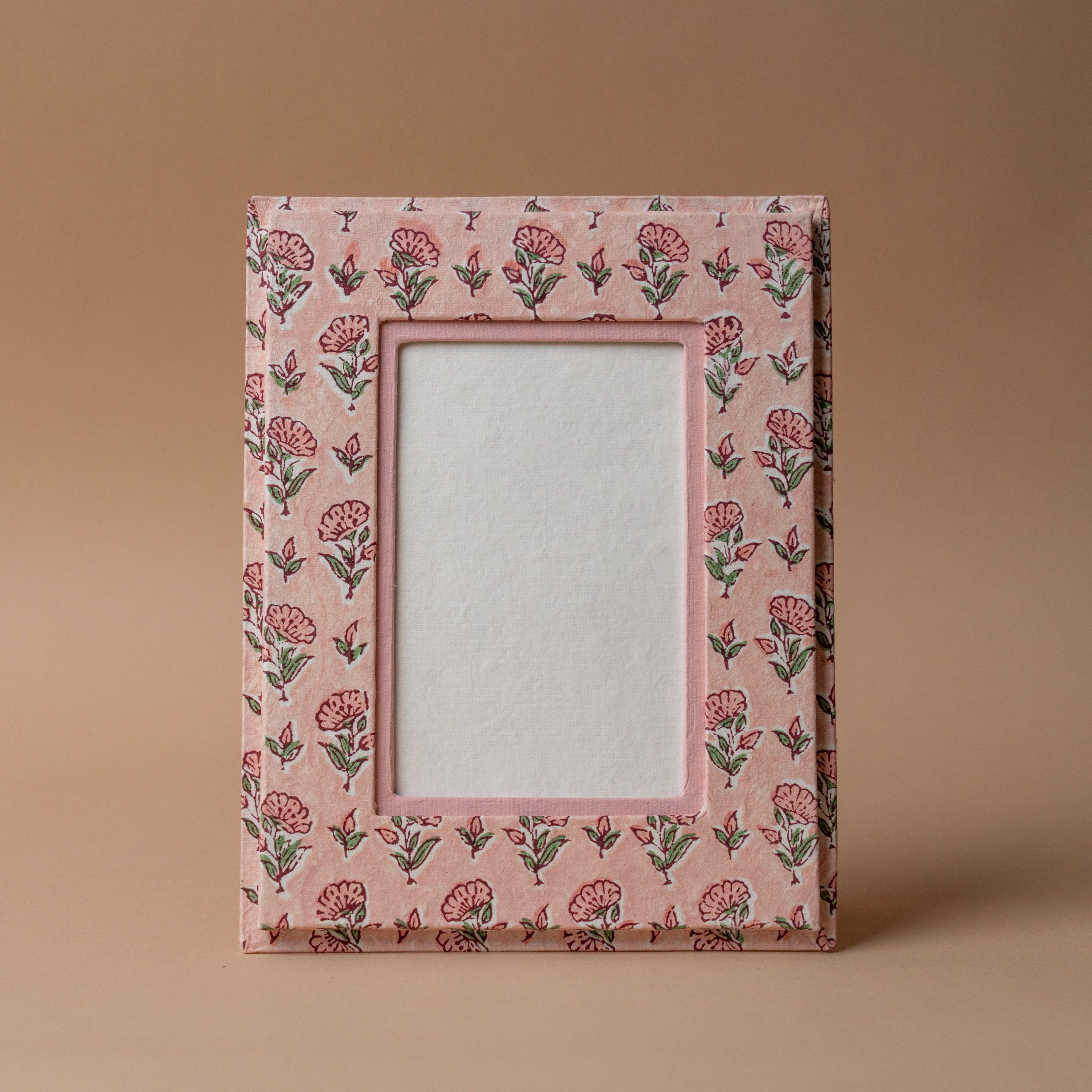 Beautifully handcrafted from recycled cotton rag paper, this picture frame celebrates both artistry and sustainability. Each piece features hand block-printed floral designs using time-honoured techniques passed down through generations. The subtle variations in every print ensure no two frames are identical, adding genuine character to your space. Made in small batches, this frame honours the slow art of craftsmanship, bringing warmth, organic texture, and vibrant colour to display your cherished memories with intention and meaning.