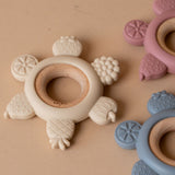 Our Fruity Teething Ring combines soft, soothing silicone fruit-shaped texture with a smooth wooden interior ring, providing a calming sensation for teething infants. Designed to fit comfortably in little hands, it supports natural grasping and sensory exploration, helping to ease discomfort during teething stages.