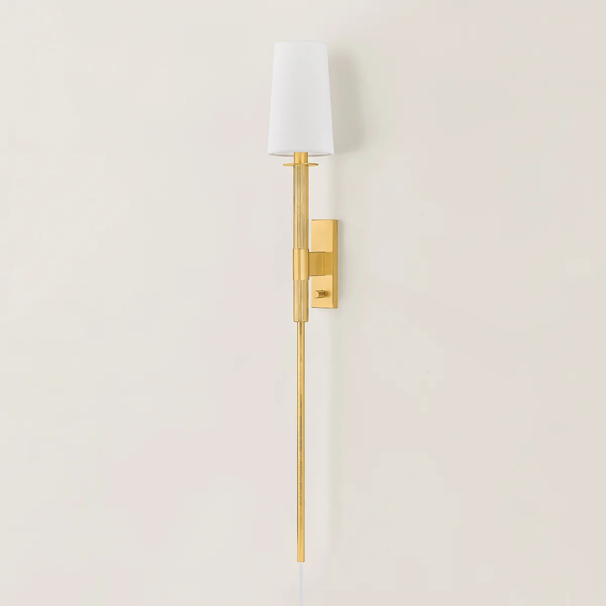 The slender stem of Ginny has a secret. This design-forward sconce cleverly hides its cord, creating a seamless and luxurious look when placed behind a nightstand, desk, or sofa. Finished in Aged Brass, the elongated silhouette is accented by a sleek bobeche, modern backplate, and a classic white linen shade.