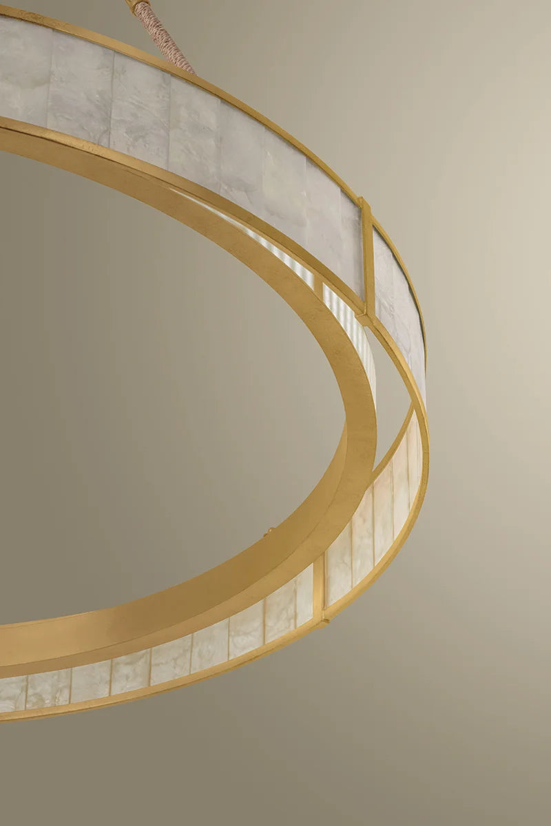 Illuminate your space with the Halcott Chandelier, where coastal elegance meets timeless sophistication. Delicate capiz panels mimic the iridescent beauty of mother-of-pearl, casting a warm, inviting glow throughout your room. The Vintage Gold Leaf finish complements the natural shimmer of the materials, while the abaca rope-wrapped suspension brings an organic, seaside charm to your décor. Available in two versatile sizes, this statement piece transforms any room into a gallery-worthy showcase of refined style and character.