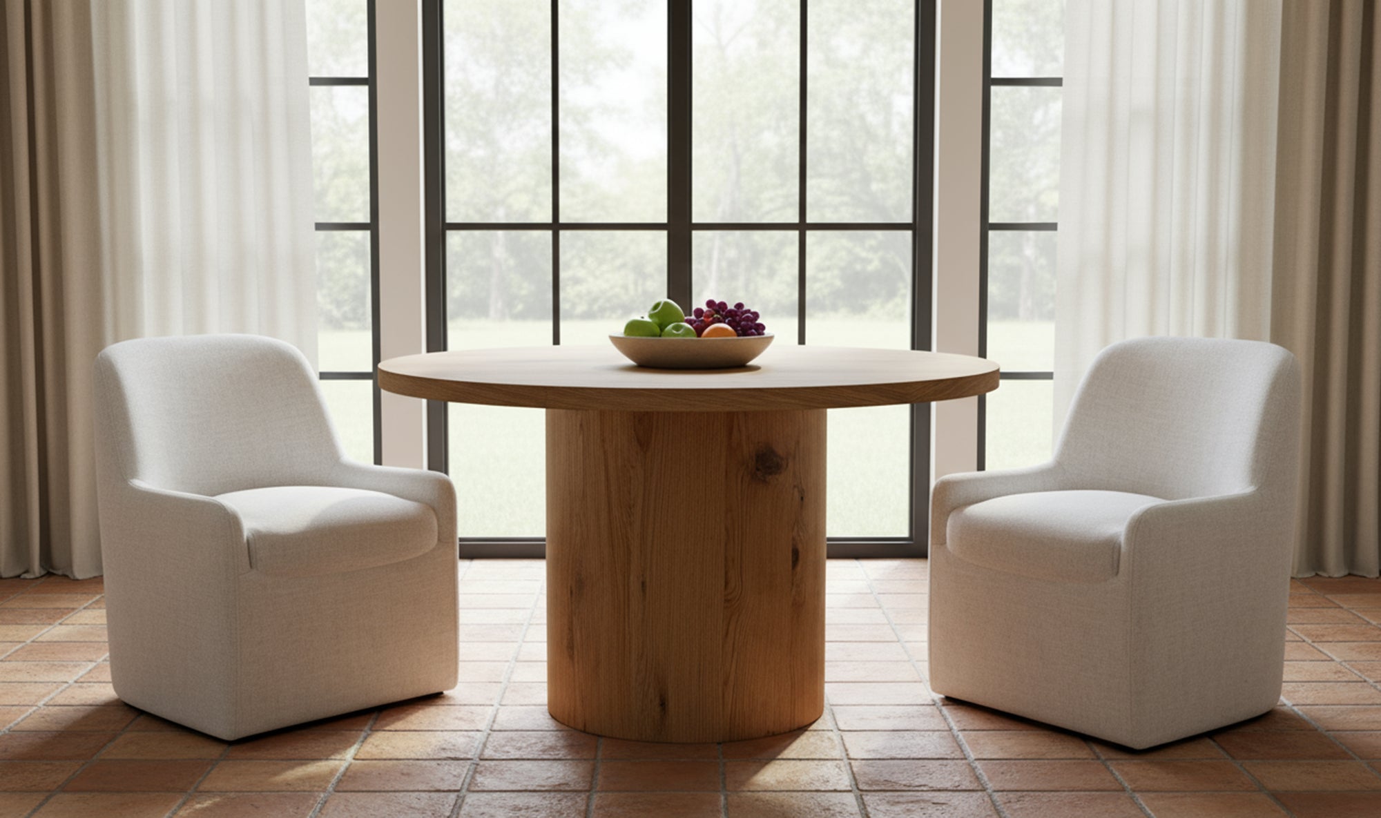 A round dining table with clean, modern design. The sturdy pedestal base supports a spacious top with a distinctive edge detail. Finished in rustic oak for warmth and character, it combines minimalist style with solid construction and timeless appeal.