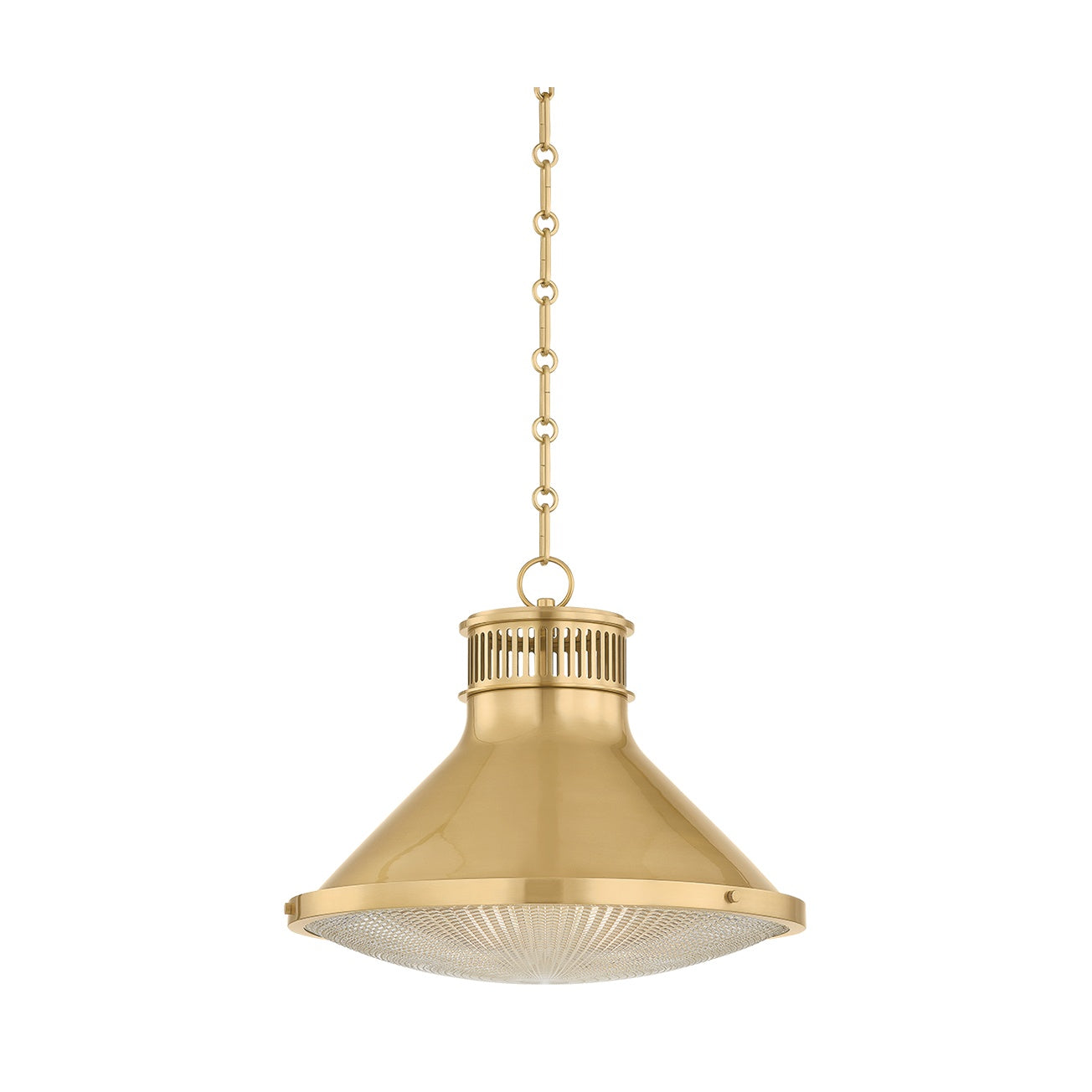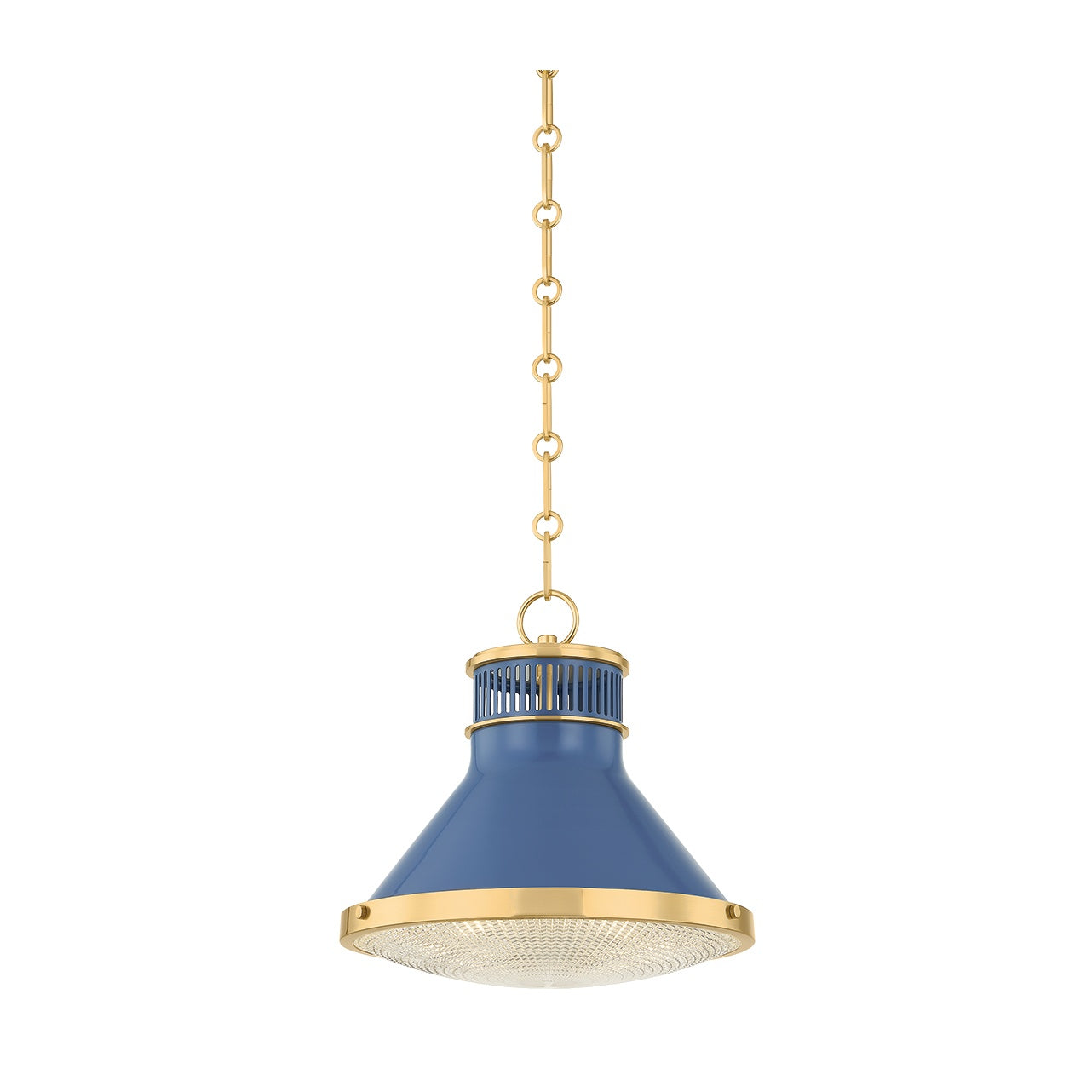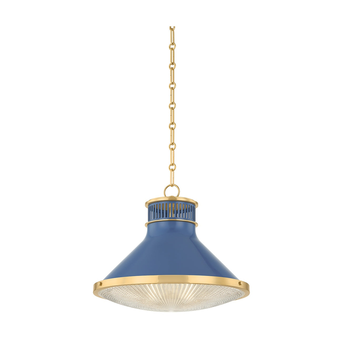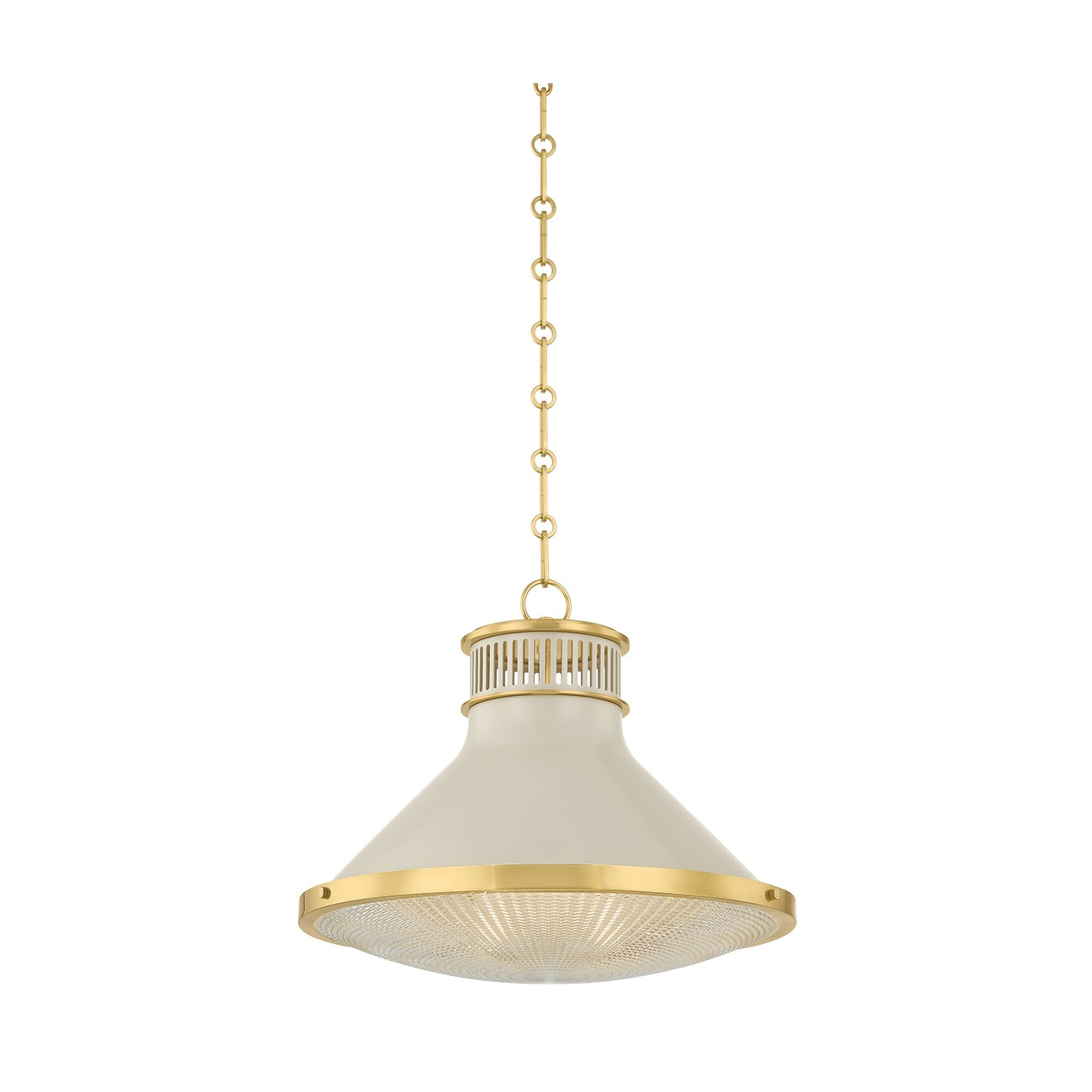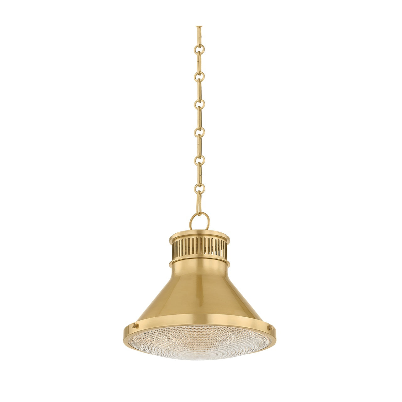 The Highclere family blends industrial and classic elements to create a modern, elevated basic. Etched for added texture, the clear optic glass shade creates a beautiful diffusion of light while the bell-shaped silhouette of the shade is accented by Mark D. Sikes' signature brass screw detailing. Highclere is available as a small and large flush mount and a small and large pendant. The three finish options include Aged Brass, Aged Brass and Off-White, and Aged Brass and Soft French Blue.