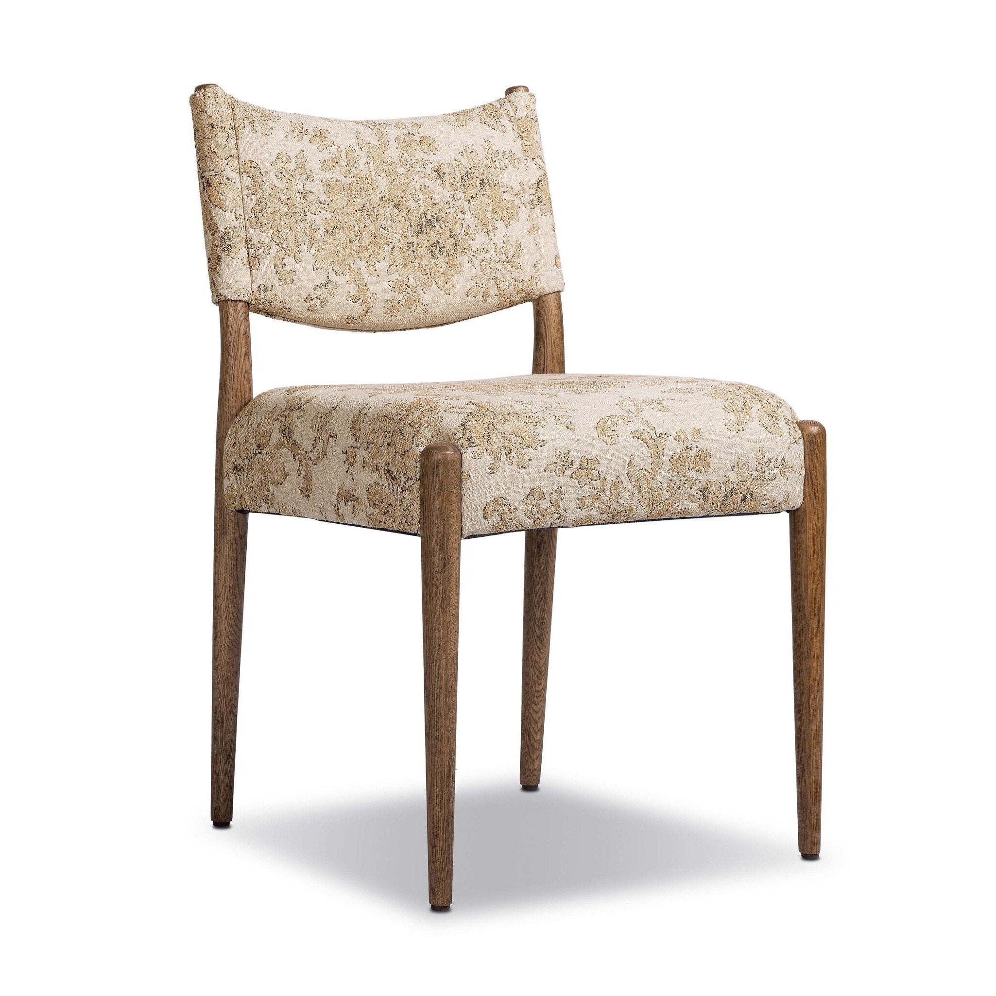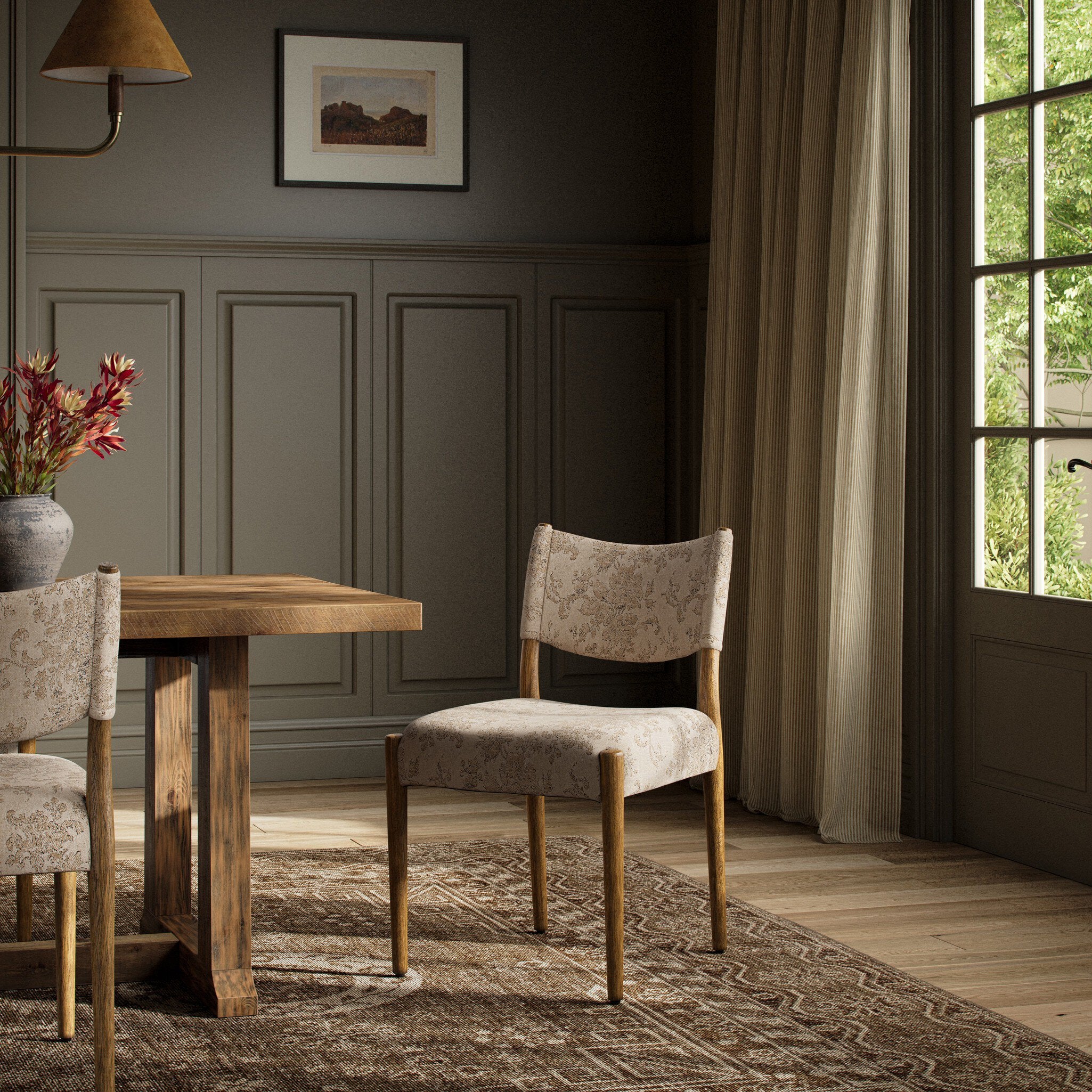 This armless dining chair channels midcentury modernism through its refined sling-back design, engineered to support natural spinal alignment during meals. The thickly cushioned seat delivers sustained comfort for extended dining occasions, while the damask upholstery adds visual depth and tactile richness to your table setting. A versatile piece that balances nostalgic design language with practical, everyday functionality.
