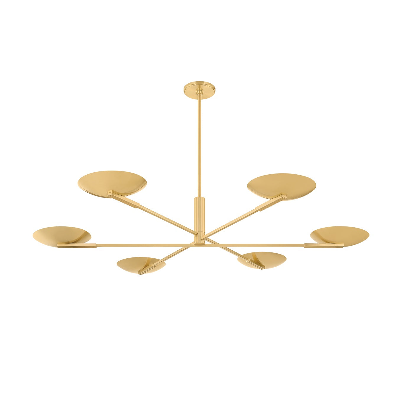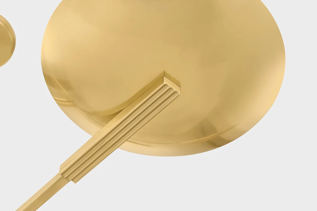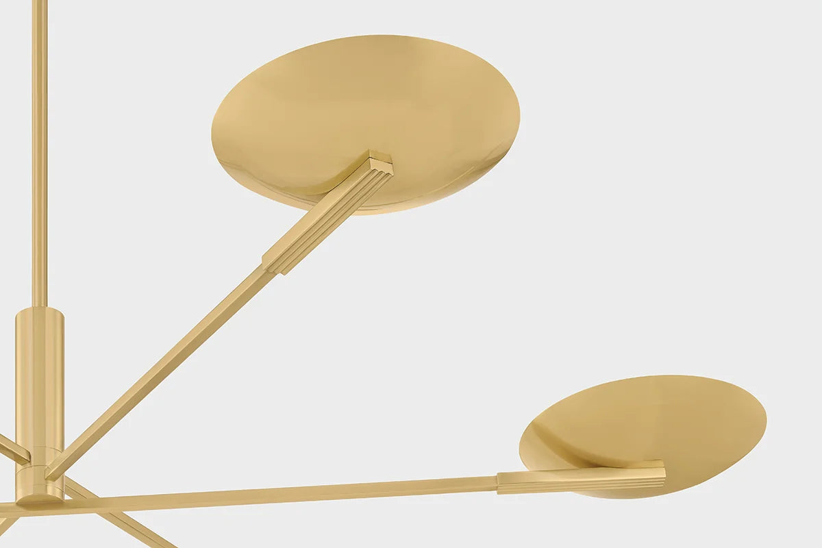 The Johnson family gives a modernist silhouette an industrial twist. Reminiscent of spokes, the slender arms of this chandelier and flush mount support shallow dome shades that direct LED light upwards. Each arm features a subtle linear knurl at the ends, while the center stem is grooved at the bottom for added texture. Finished in Aged Brass.