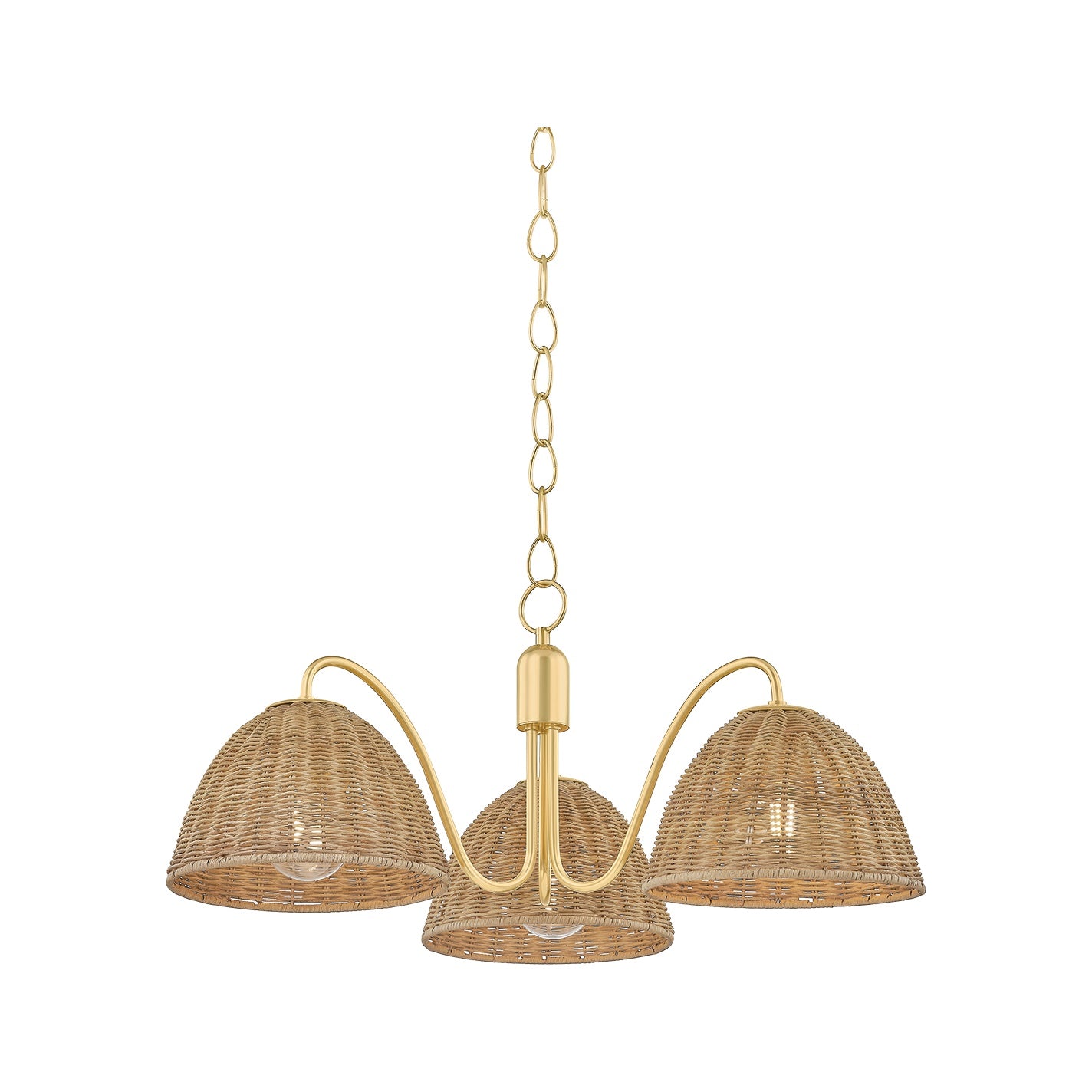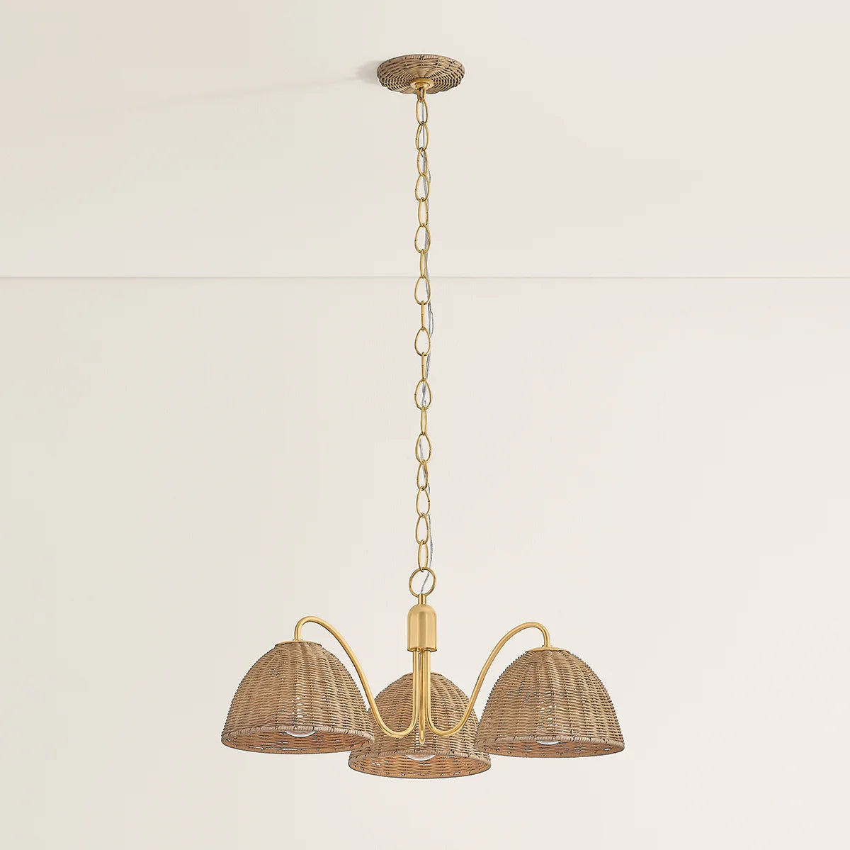 The Katniss collection modernizes a classic form with handwoven vintage natural wicker shades shaped like mushrooms, inspired by organic, botanical themes. Its Aged Brass frame features gracefully curved arms that complement the shades for an elegant detail. Offered as a sconce or a chandelier with three or five lights, Katniss introduces both texture and playful charm to any interior.
