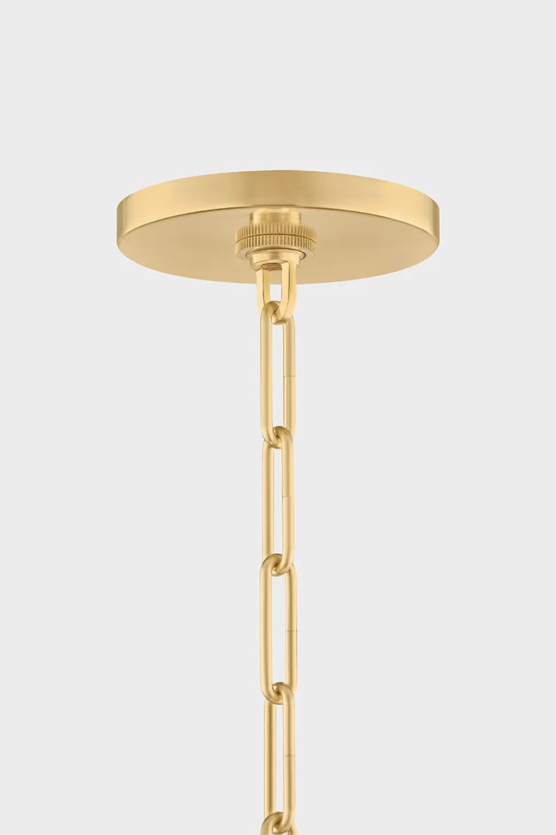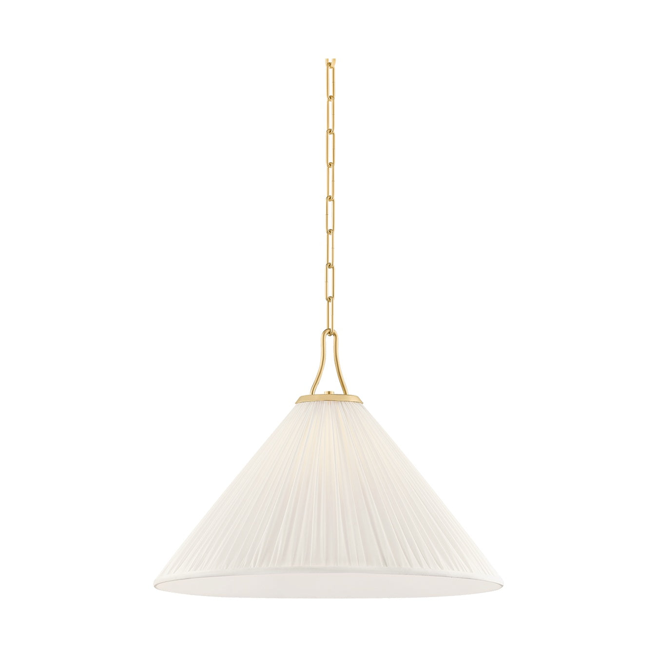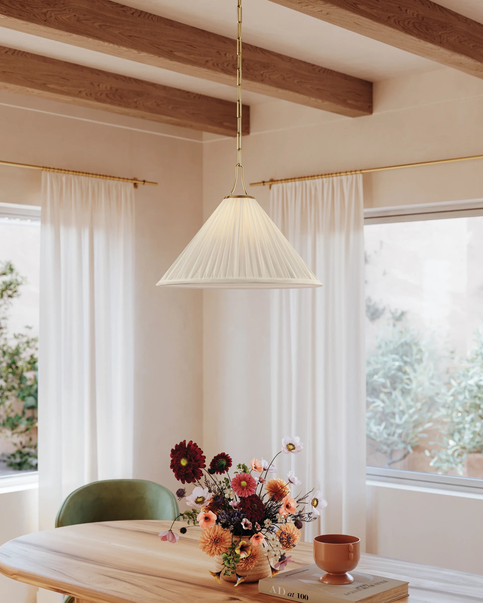 Elegant in its simplicity, the Merida pendant pairs a pleated faux silk shade with crisp metalwork. A sleek racetrack loop extends from the top of the fixture, its elongated shape seeming to be drawn downward by the weight of the shade. Finished in Aged Brass, this special detail and classic chain add a clean modern touch to the design. Available in two sizes.
