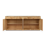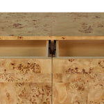 A simple, understated shape keeps this piece's spotlight on its swirling mappa-burl pattern. All-natural poplar is beautifully finished to amplify the organic shading with all its highs and lows. The plinth-base sideboard includes four shallow drawers and four push-latch doors. Each piece is completely unique with variations in color and pattern inherent to the wood.