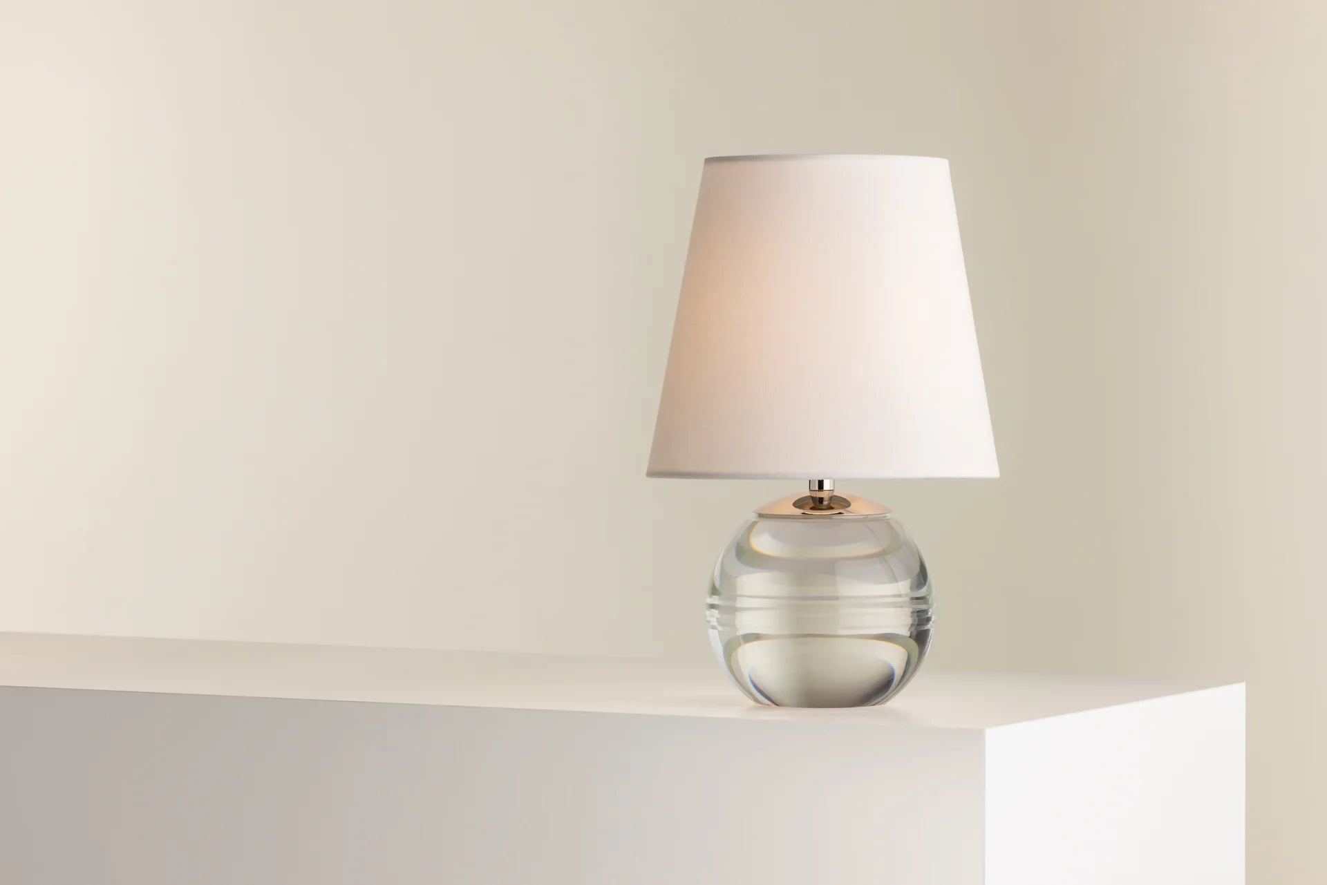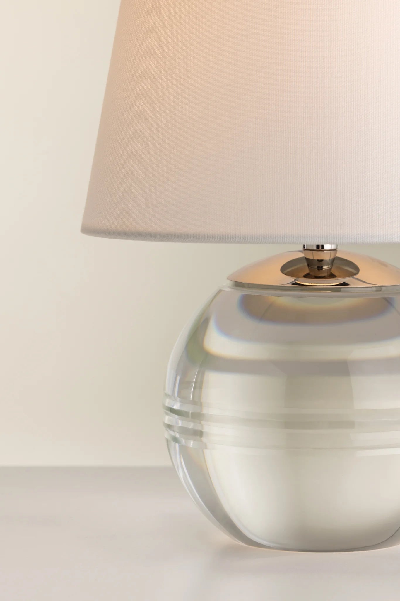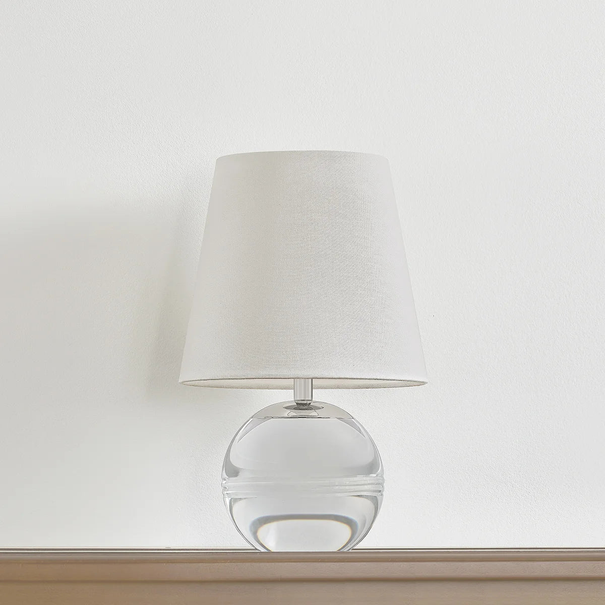 Ridged with ripple-like cuts, the crystal base of the Nicole table lamp makes for an eye-catching accent piece. Topped with a beautiful white linen shade, this pretty portable is rechargeable, adding convenience when styling. With classic Aged Brass-finished hardware, it’s the perfect addition to any bookshelf or small space.