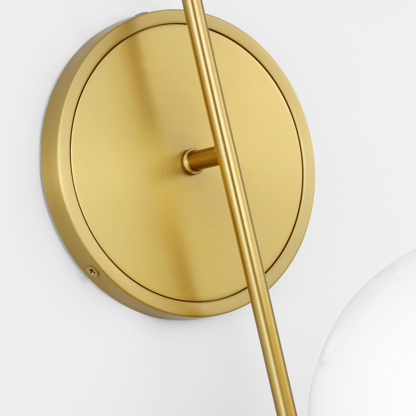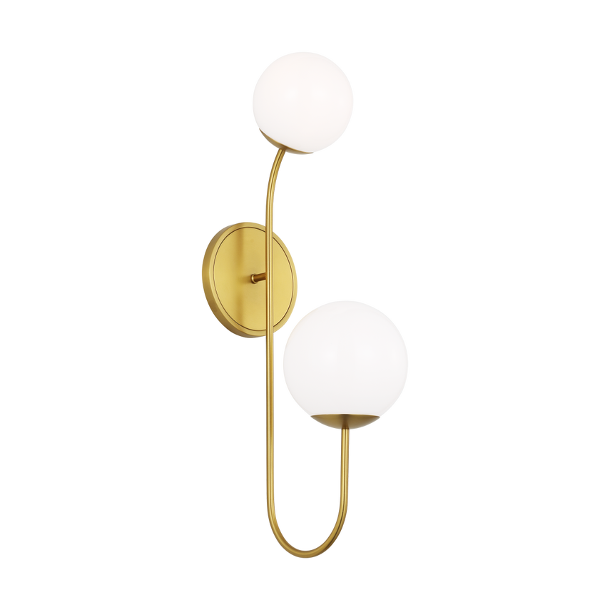 The Noemie Large Sconce by kate spade new york features two frosted glass orbs on curved arms extending from a simple backplate. Its sleek, sculptural design suits modern and art deco styles, adding soft light and elegance to living rooms, hallways, or entryways. Damp-rated for flexible use, it merges practicality with refined aesthetics.