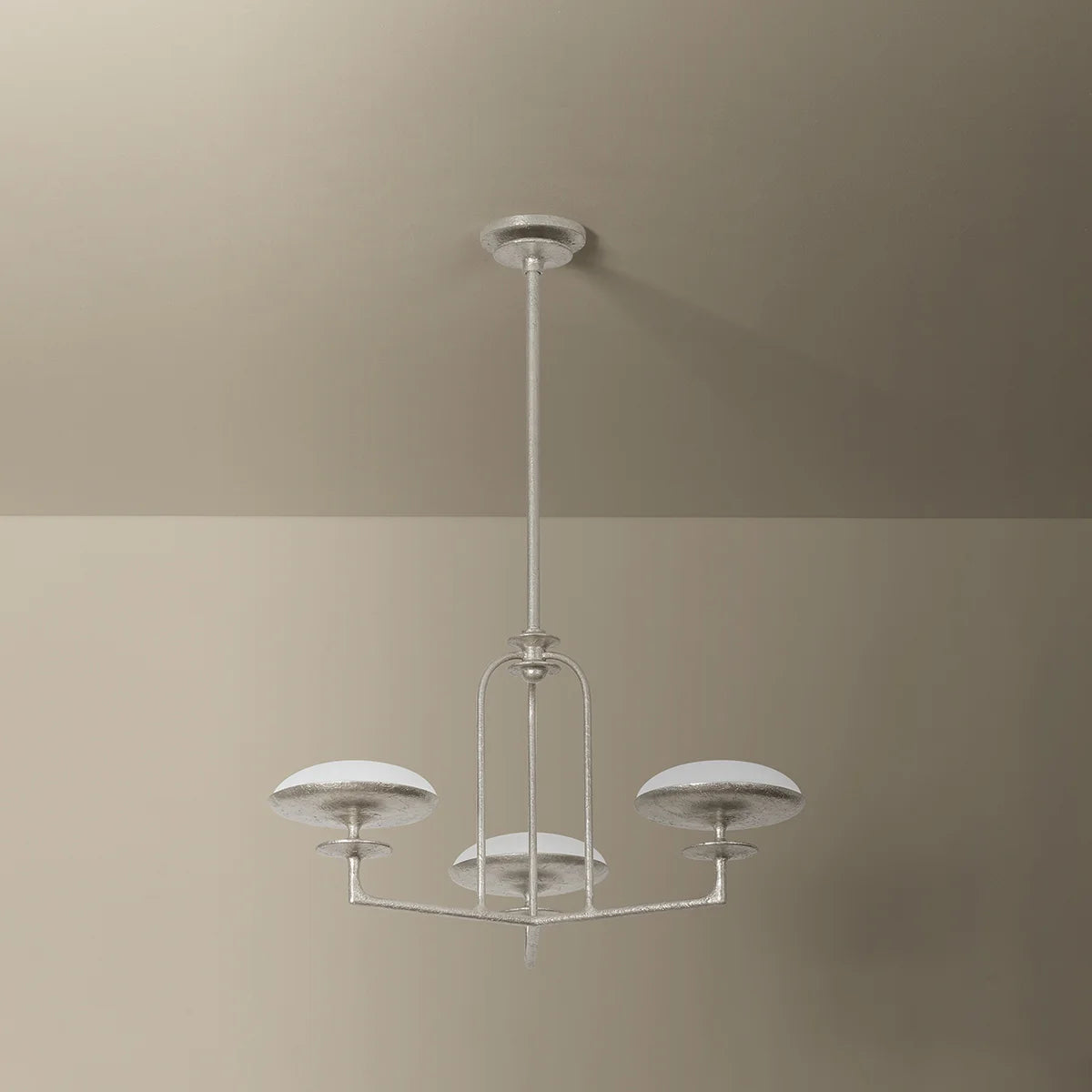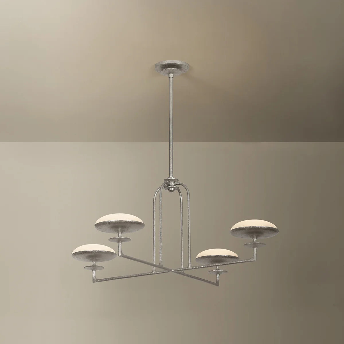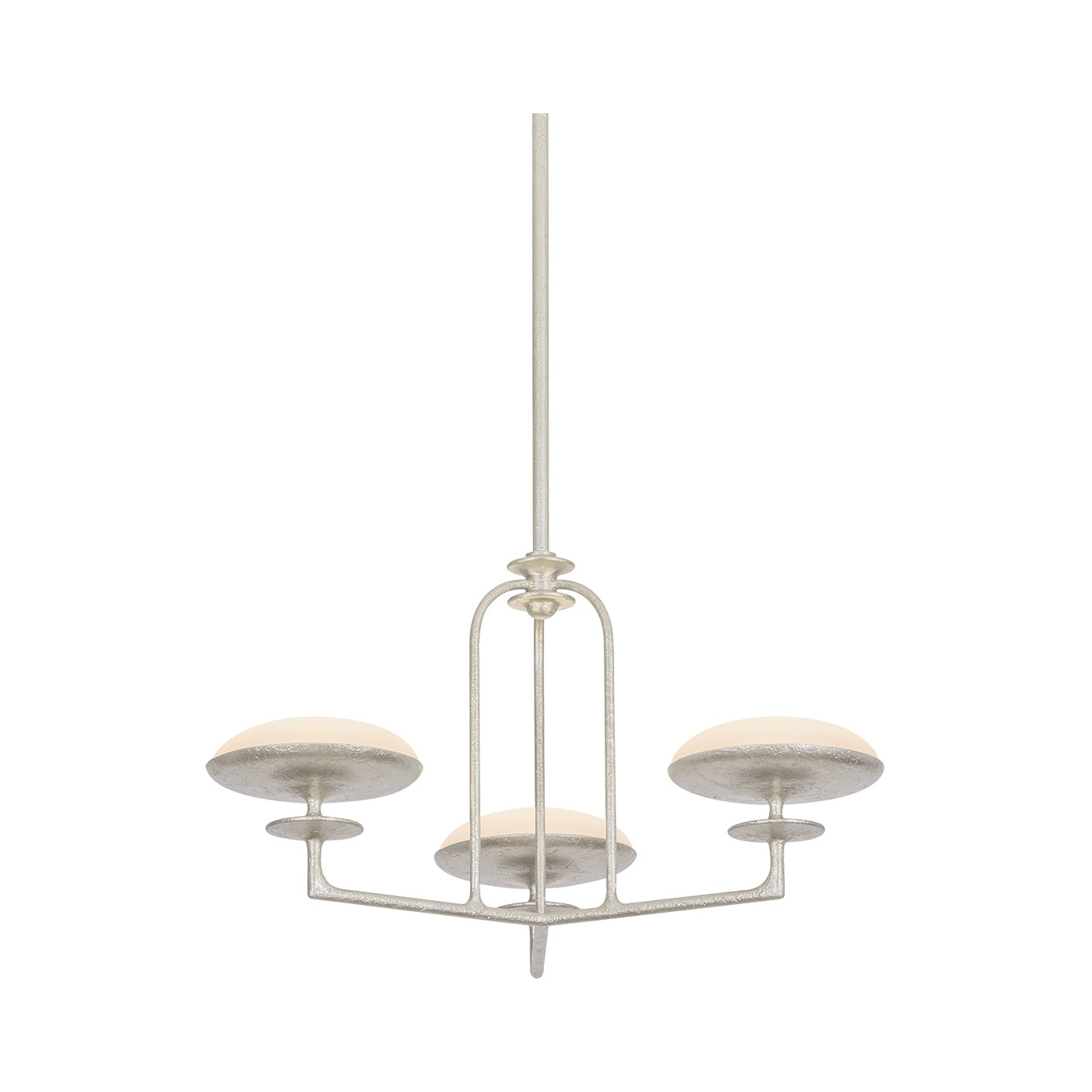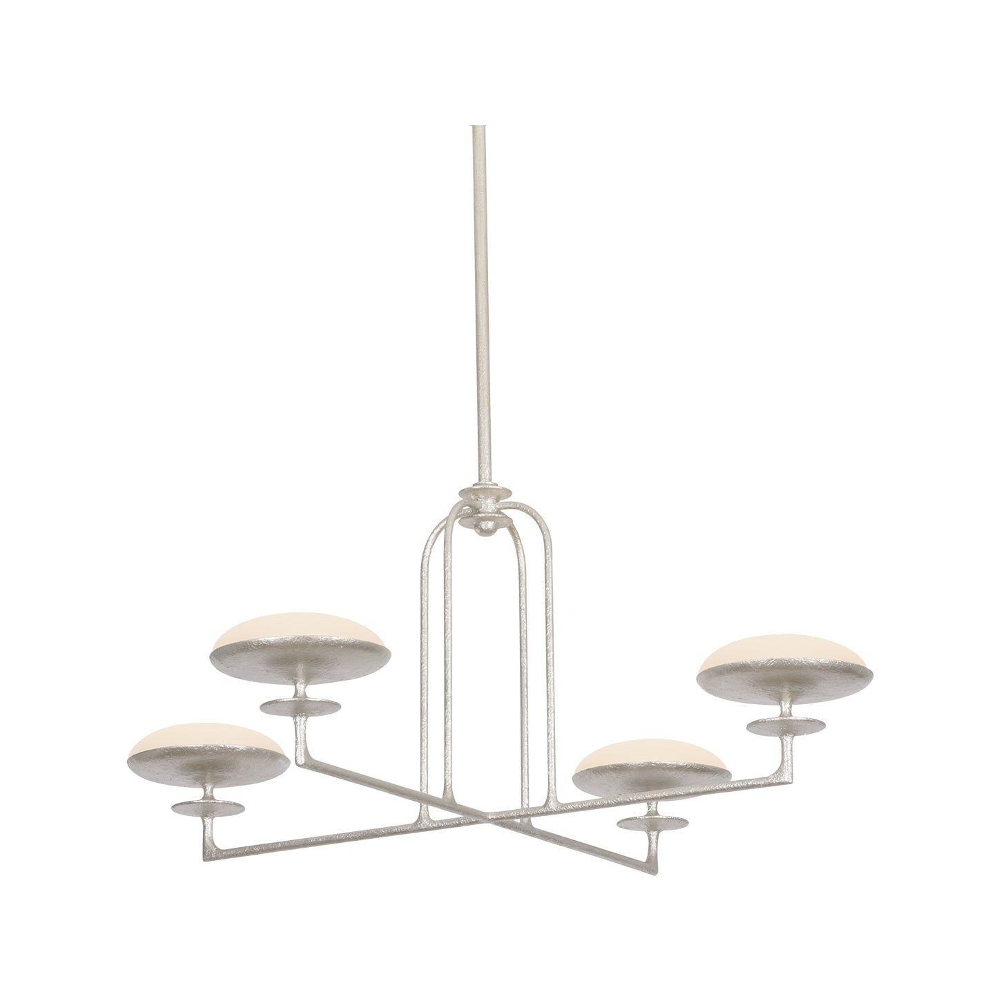 The Pacific collection addresses the demand for straightforward yet sculptural chandeliers suited to modern interiors. Its handcrafted Warm Silver Leaf finish enhances the texture of geometric forms, architectural arches, and decorative bobeches, while etched matte glass shades gently diffuse light. Available as a 1-light wall sconce, 2-light linear fixture, and 3- or 4-light chandelier, Pacific serves as a striking centerpiece in any room.