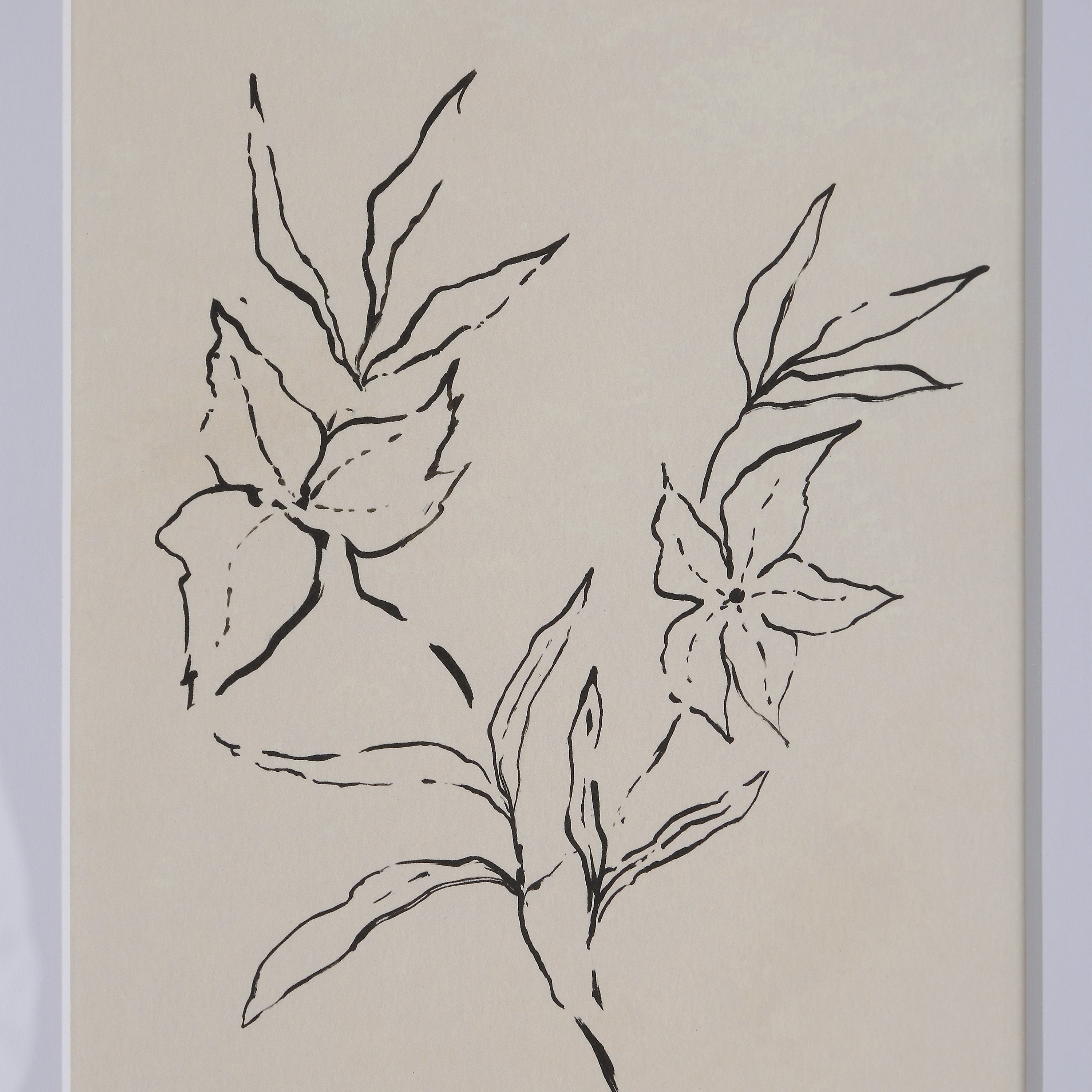 This set of four botanical wall art pieces offers a contemporary twist on traditional design. Each print is presented within a medium walnut veneer frame and accented by a wide mat that emphasizes the elegant, minimalist line drawings. Ideal for arranging in a grid or a linear formation, these artworks bring a timeless sophistication to any space with their understated, neutral palette.