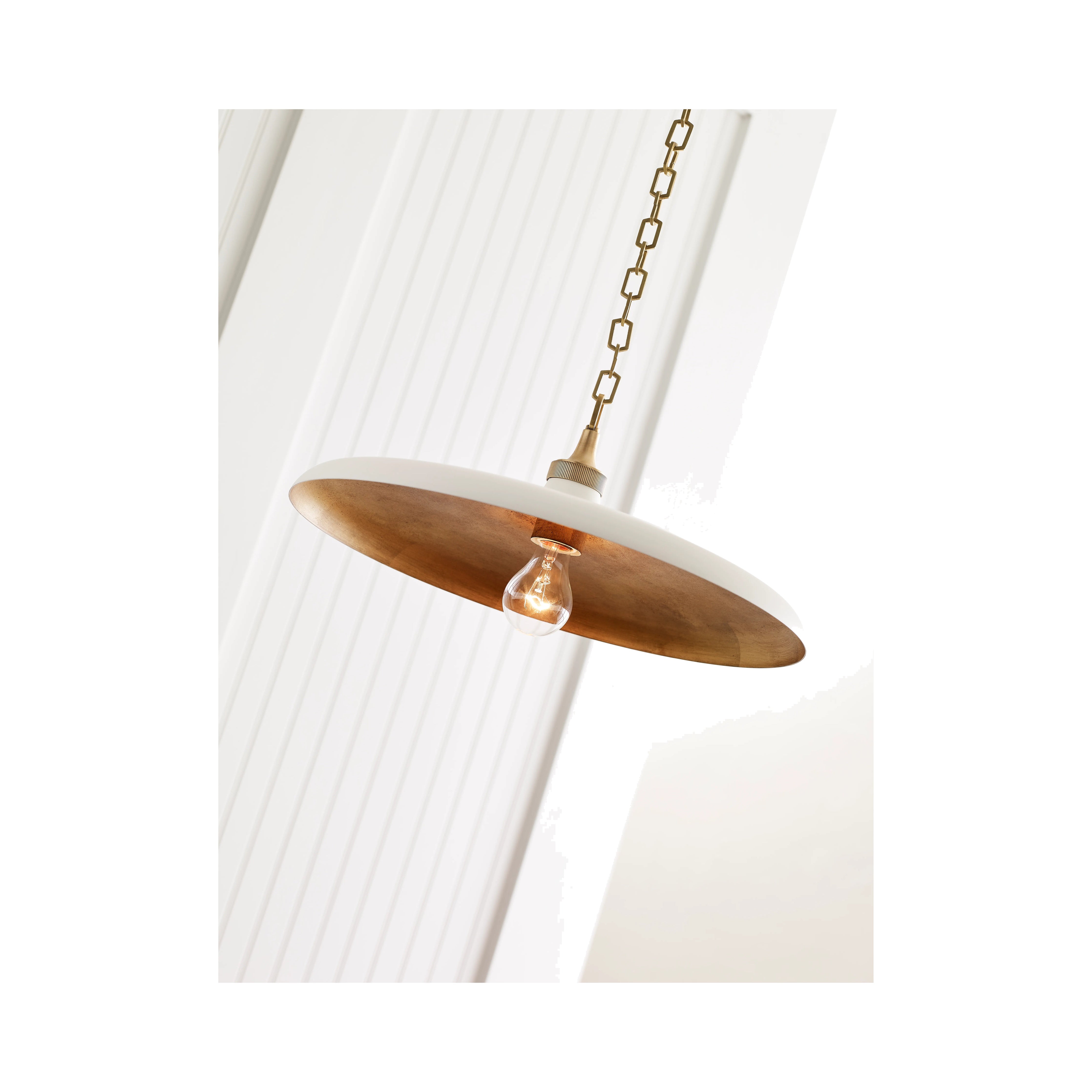Thomas O’Brien’s Piatto series offers a fresh and dramatic approach to elegance. Combining chic and casual elements, the distinctive low shades feature rustic gilding on the interior to reflect light in a contemporary manner. These lights make a unique and graceful statement in kitchens, dining rooms, and hallways.