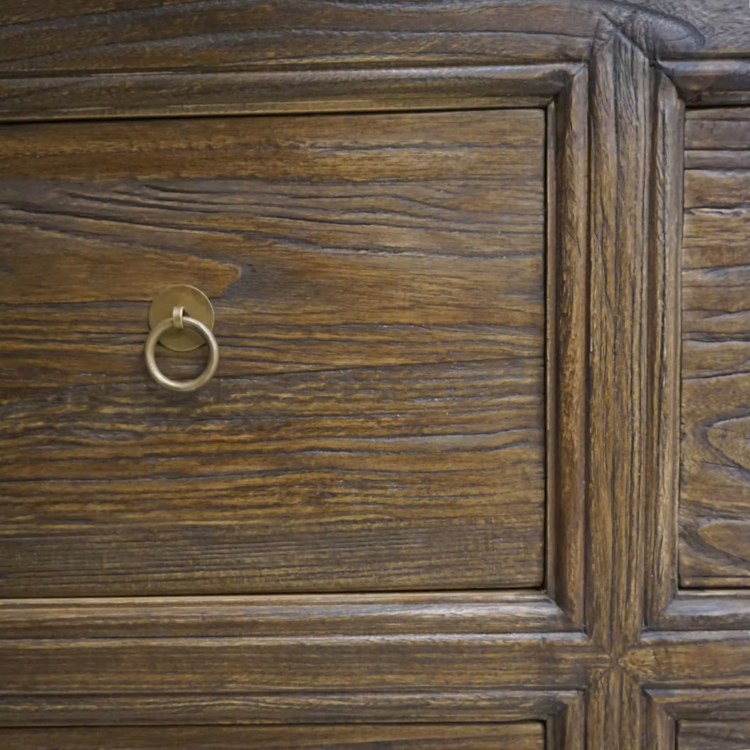 The design of the Reid Sideboard focuses on functionality, offering a series of drawers that provide ample storage space. The bronze ring hardware adds a touch of elegance and complements the rustic look of the wood, creating a harmonious visual contrast.