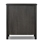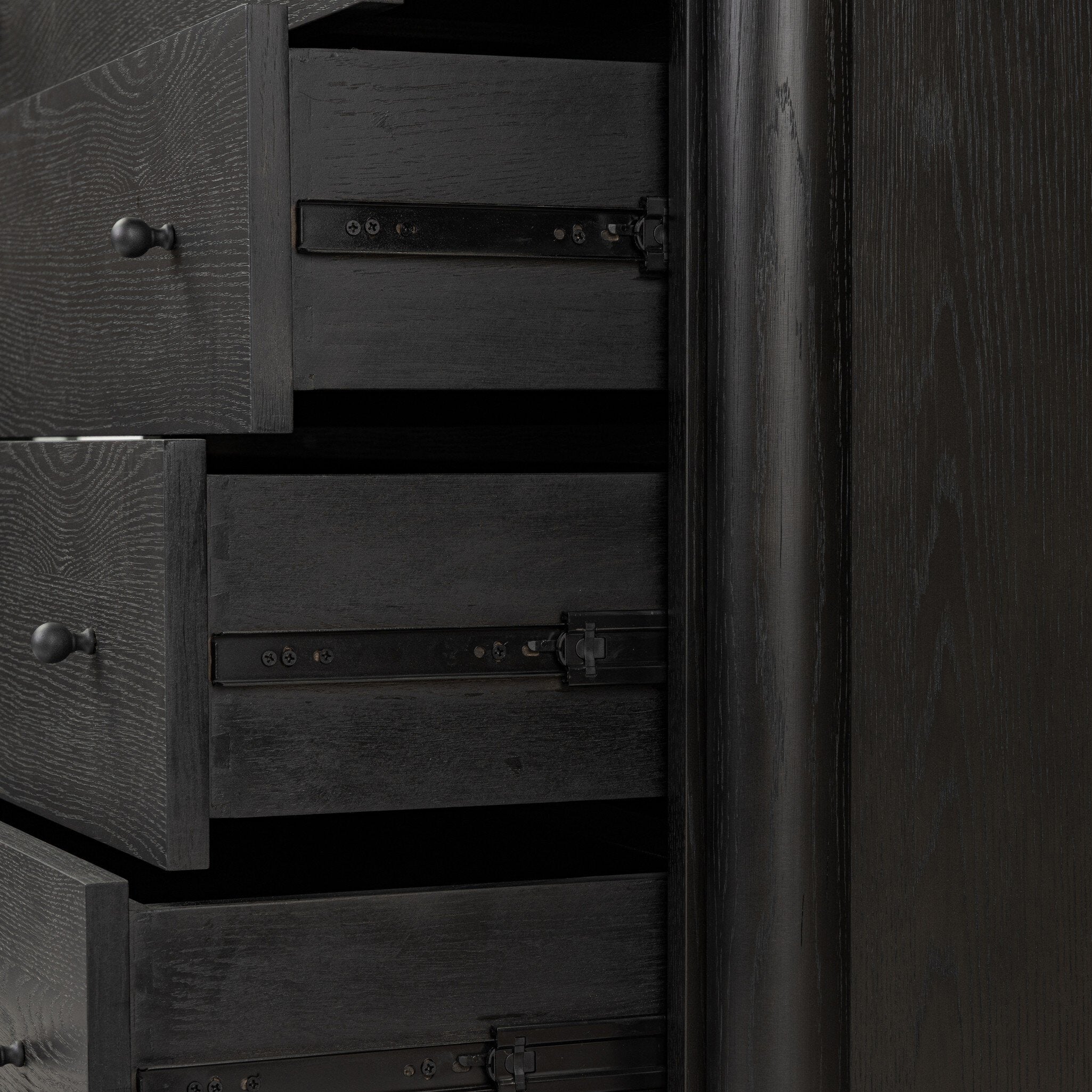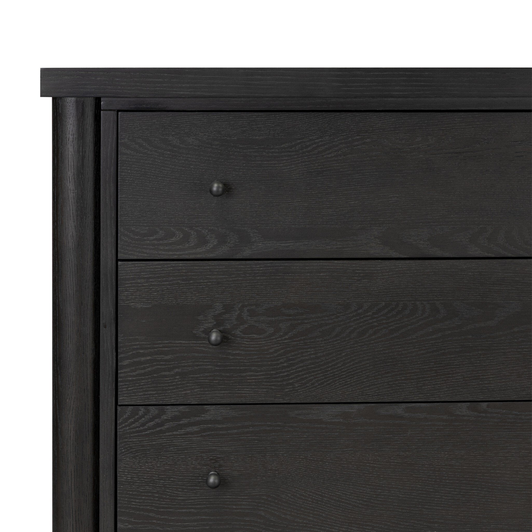 Create storage space in the bedroom with a five-drawer dresser of amber-finished oak. Chunky dowel legs support a tall silhouette and overhang top, all finished out with simple gunmetal hardware.