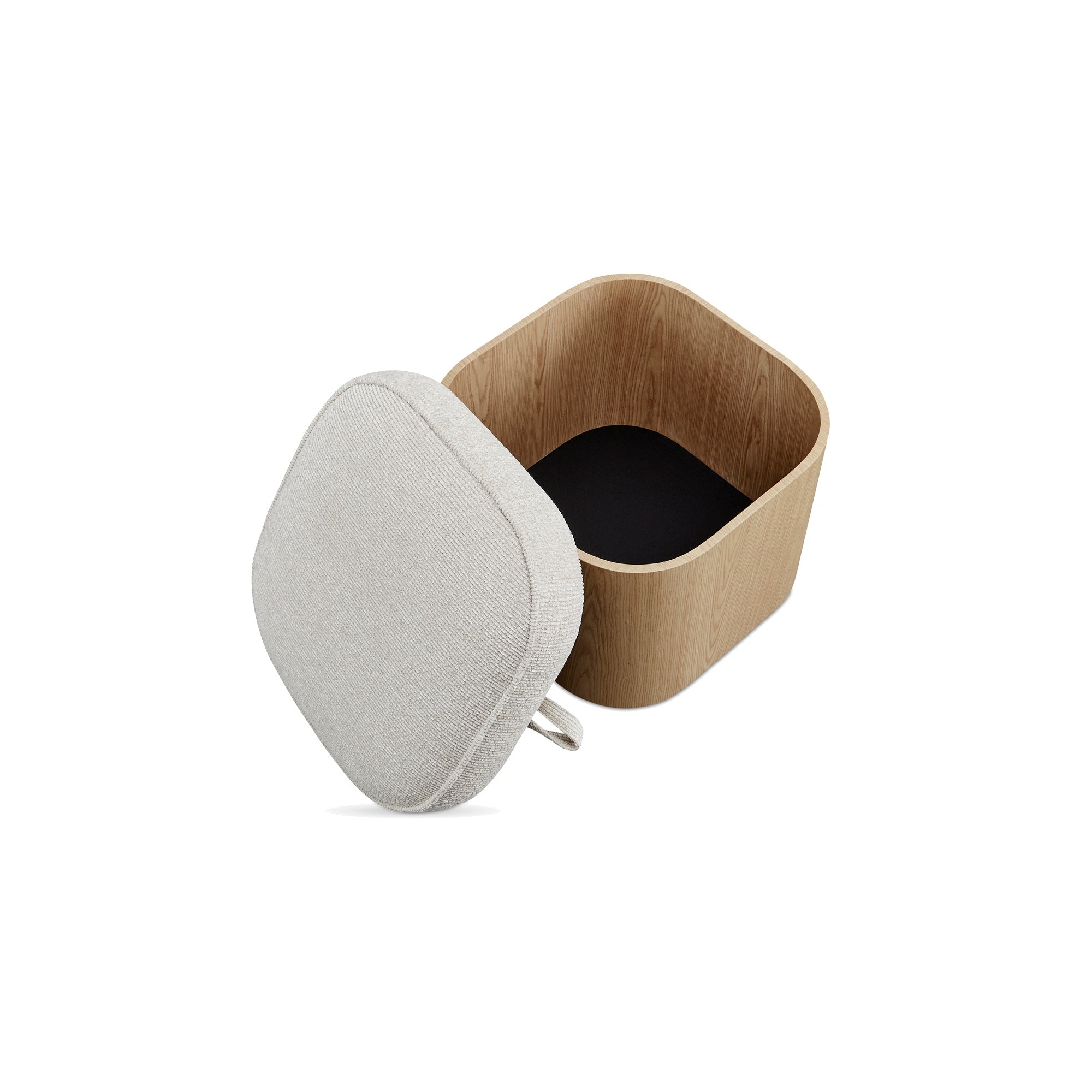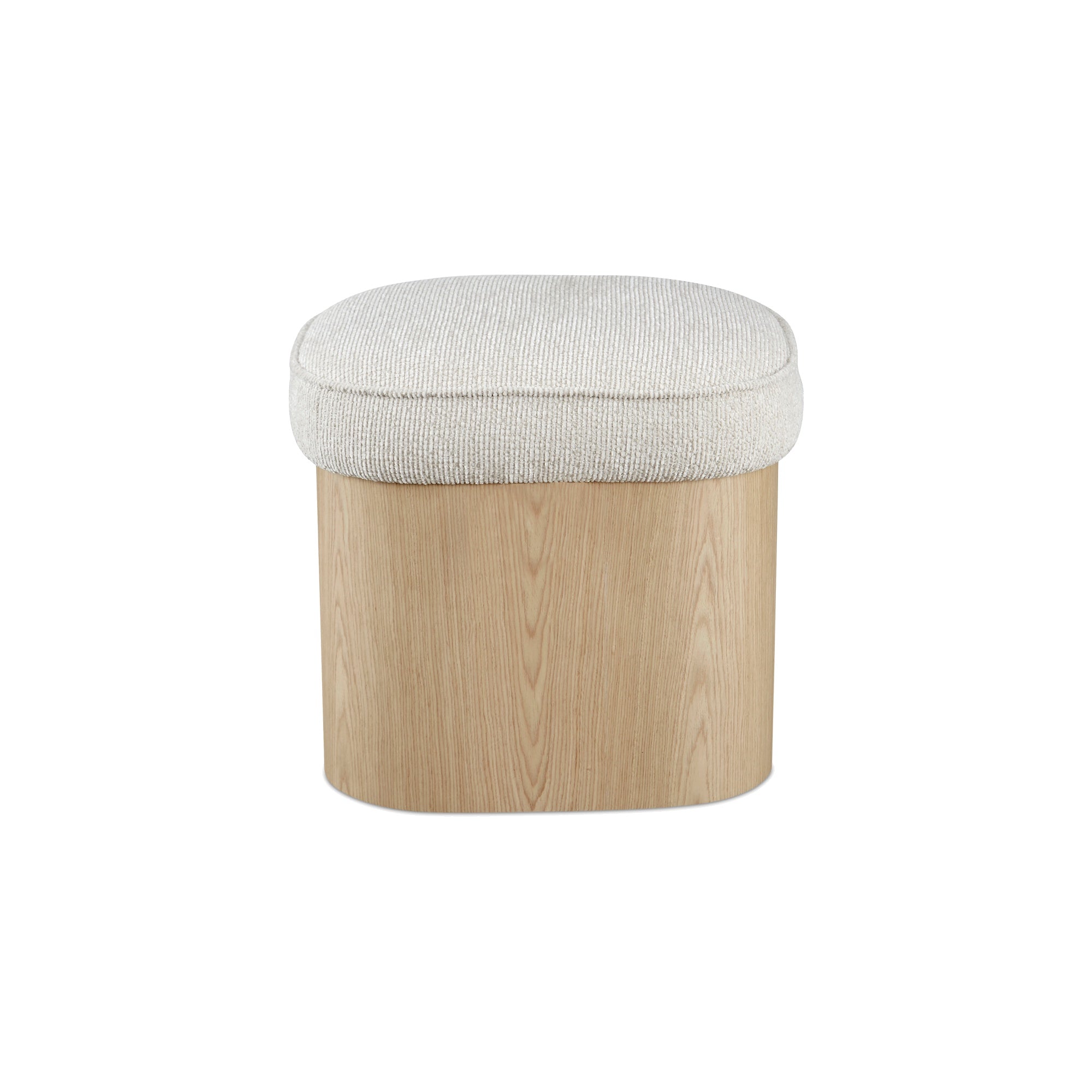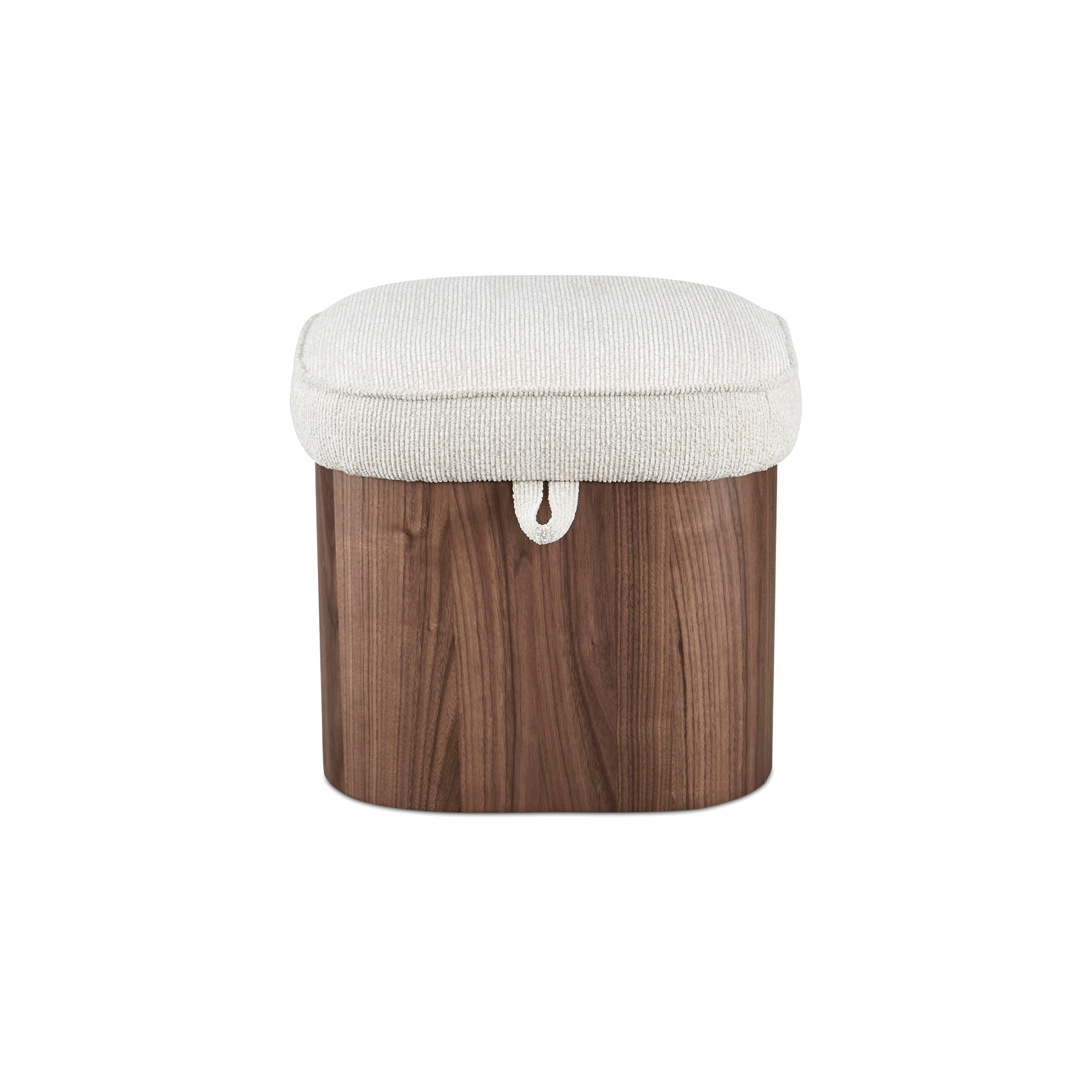 The Saxon Stool combines stylish simplicity and practical functionality. Its plush seat is upholstered in flecked oatmeal fabric and contrasts beautifully with the solid walnut veneer base. Lift the top to reveal discreet storage for added convenience. Its curved corners create a serene silhouette, making it a perfect addition to any space.